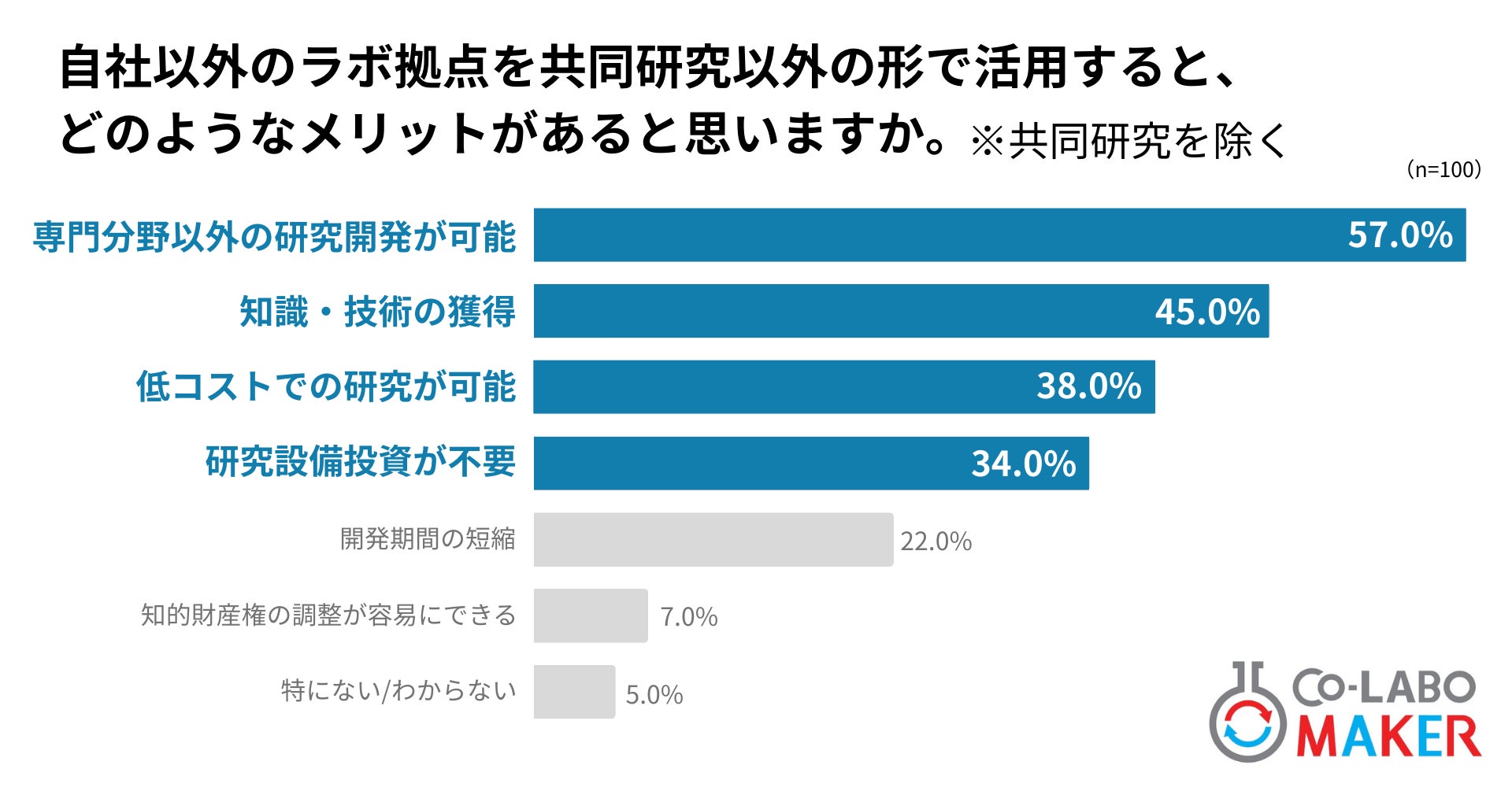 自社以外のラボ拠点を活用することで、どのようなメリットがあると思うか尋ねたところ、「専門分野以外の研究開発が可能」が57.0%と最も多く、「知識・技術の獲得」が45.0%、「低コストでの研究が可能」が38.0%と続きました(n=100)。