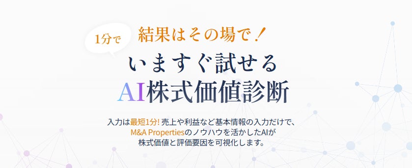 M&A仲介・アドバイザリーサービスを提供する株式会社M&A Properties(本社:東京都新宿区西新宿、代表取締役:後藤俊輔・中村幸司、以下「当社」)は、この度、AIを活用し、わずか1分で企業の概算株式価値を算定できる無料ツール「AI株式価値診断」をリリースいたしました。