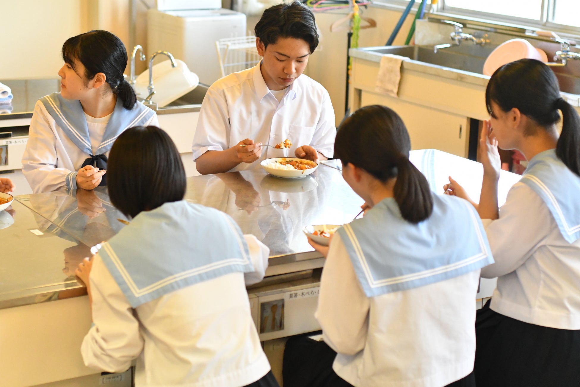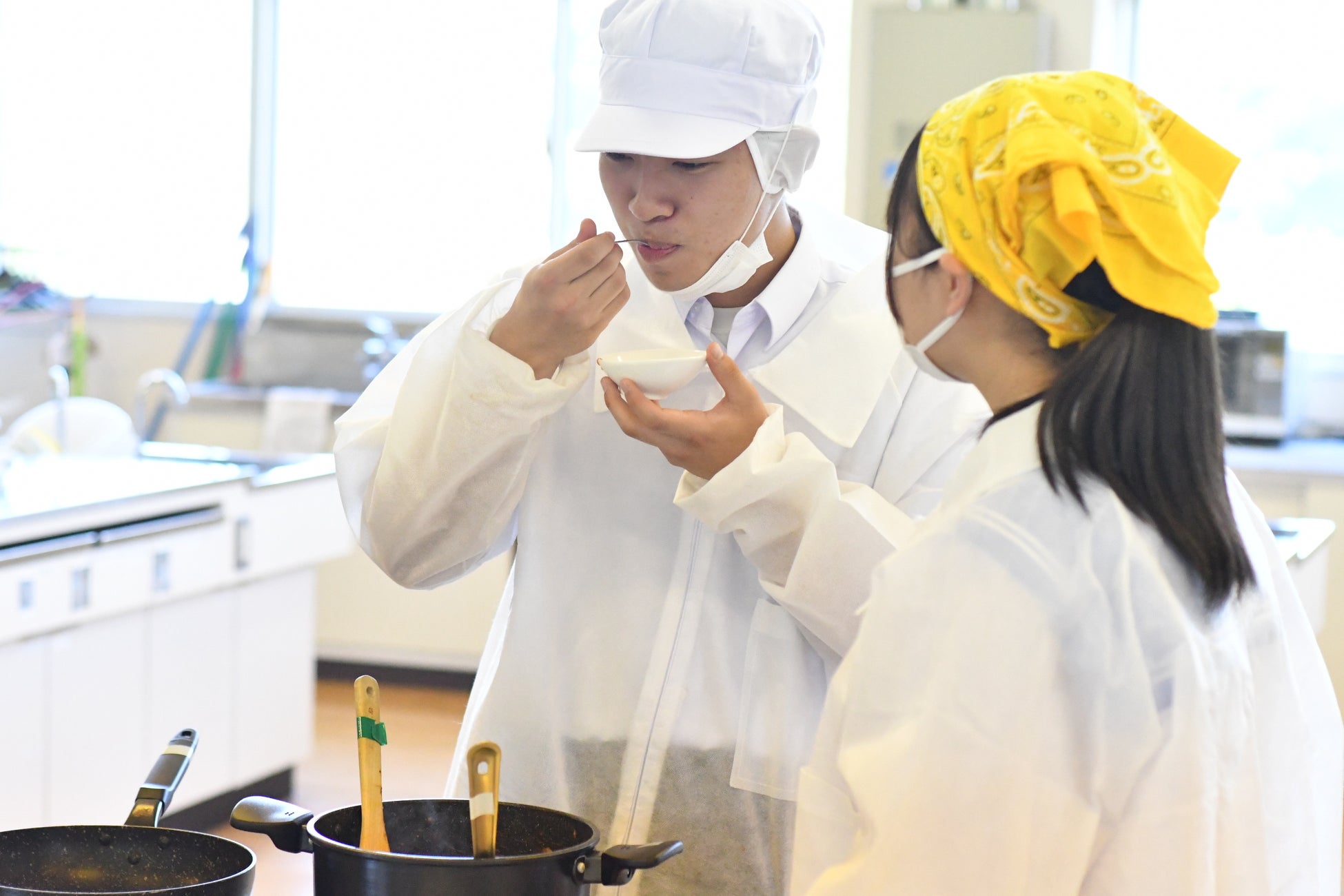 高齢者の健康課題を学び、不足するカルシウム、タンパク質を補うため、浜田漁港(島根県浜田市)で水揚げされ、加工会社で処理された魚の未食部分の粉末と矢上高校で産業技術科の生徒たちが加工実習で作った矢高味噌をカレーの隠し味に考えました。試作を繰り返し、高タンパク豆カレーを完成させ、2023年10月18日に介護施設で調理し、高齢者の方々に提供を行います。