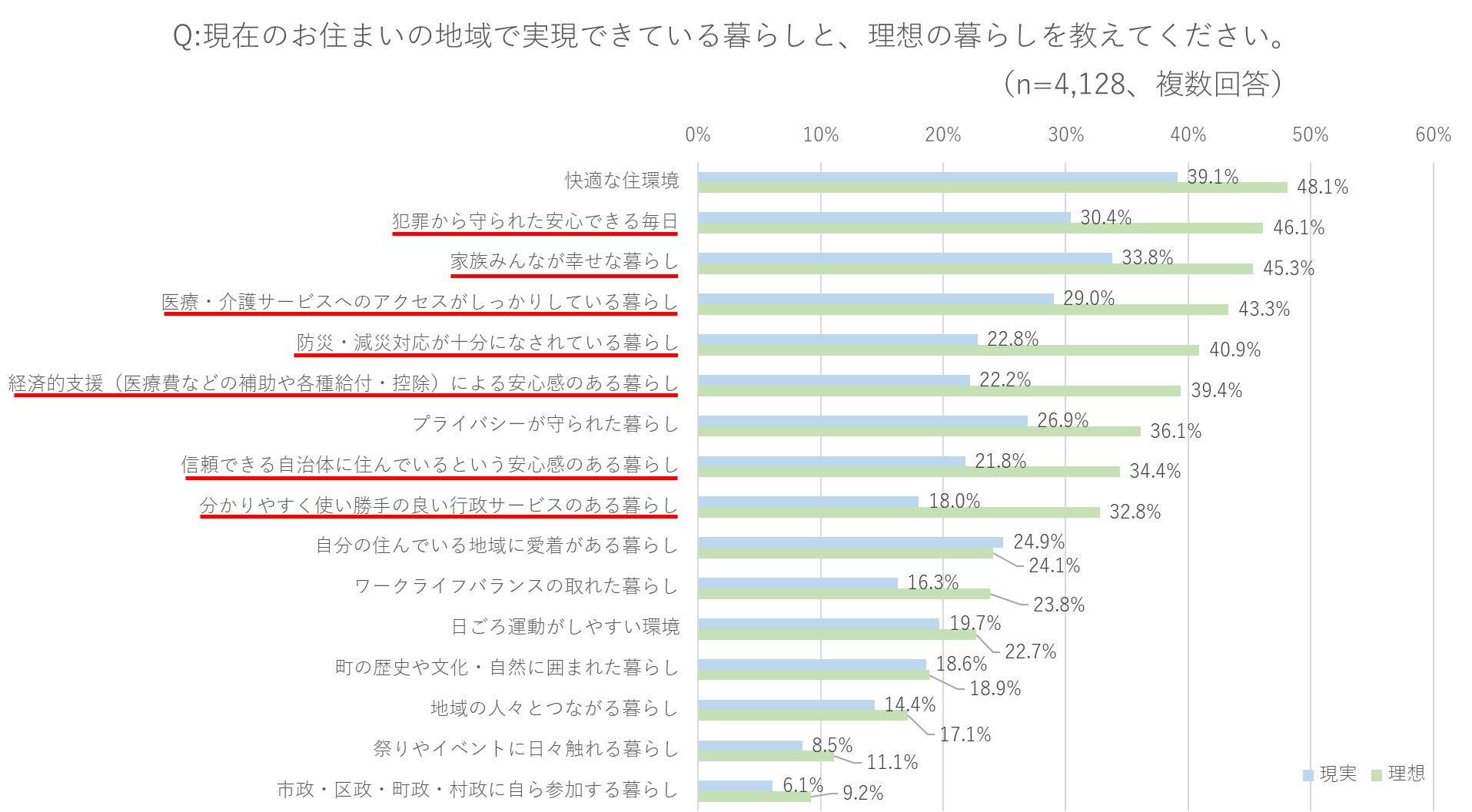 現実と理想の暮らしの差が開いた(現実と理想のポイントが10%以上開いたもの)のは、「犯罪から守られた安心できる毎日」「家族みんなが幸せな暮らし」「医療・介護サービスへのアクセスがしっかりしている暮らし」「防災・減災対応が十分になされている暮らし」「経済的支援による安心感のある暮らし」「信頼できる自治体に住んでいる安心感のある暮らし」「分かりやすく使い勝手の良い行政サービスのある暮らし」だった。