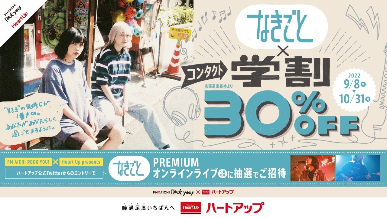 株式会社日本オプティカル(代表取締役社長 前田貴志)は、人気急上昇中の東京出身2人組ロックバンド「なきごと」とコラボレーションした【ハートアップ×FM AICHI ROCK YOU! Presents】 「コンタクト学割×なきごと」を2022年9月8日(木)~10月31日(月)の期間、開催致します。