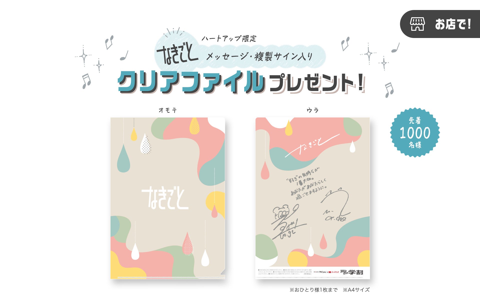 ハートアップ店舗に来店し、キャンペーンページやハートアップアプリ内の「コンタクト学割×なきごと クーポン」をご提示頂いた方にプレゼント致します。 ※おひとり様1枚まで。※なくなり次第終了となります。