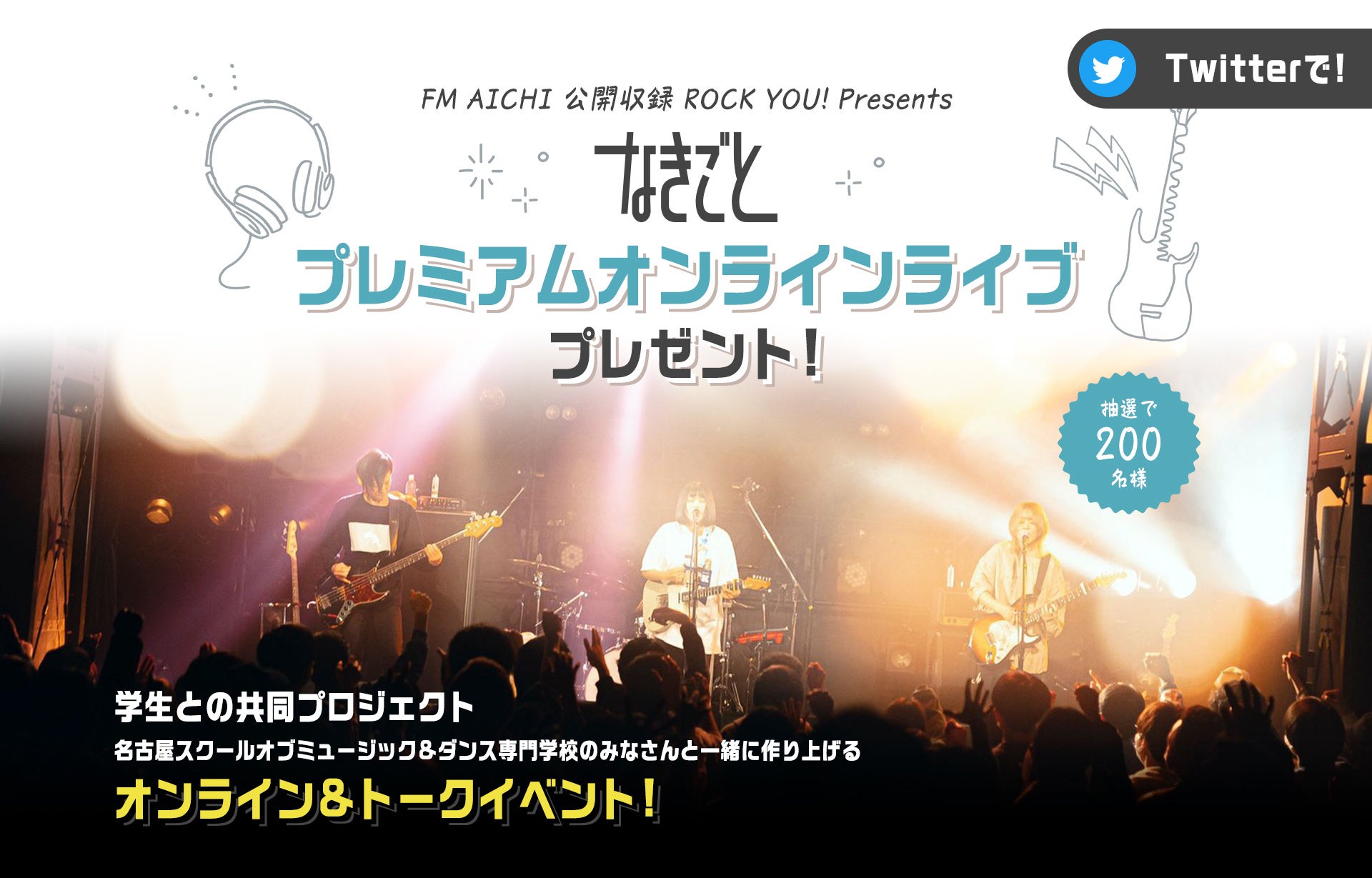 【FM AICHI ROCK YOU!×ハートアップ ×NSM】企画として、なきごとプレミアムオンラインライブ&トークショーを実施します。こちらに抽選で200名様をご招待!イベントの模様は、後日FM AICHIでもオンエアされます。