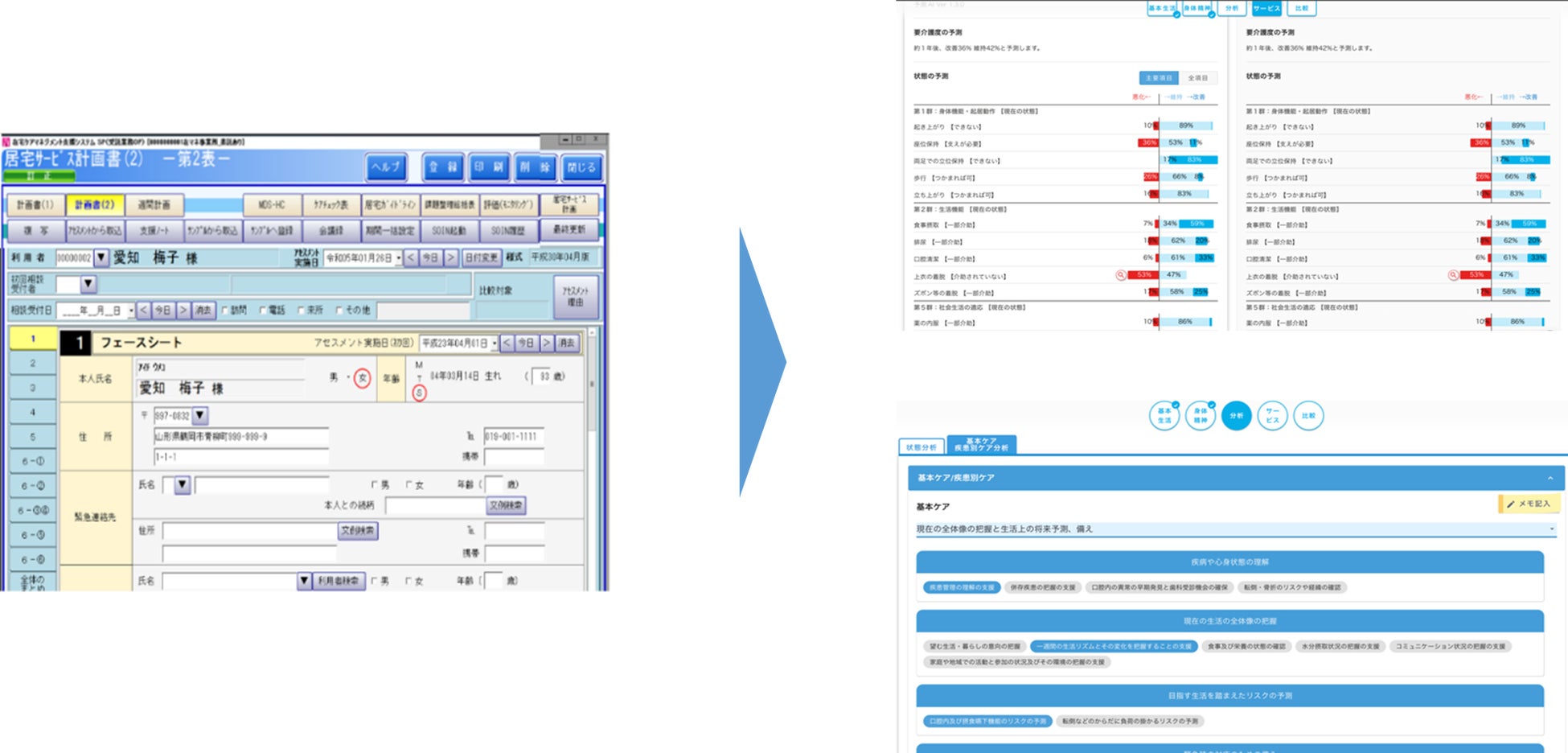 今回、「在宅ケアマネジメント支援システムSP」に搭載されたAIにより、厚生労働省が普及推進を行う「適切なケアマネジメント手法」を踏まえたケアの具体化の検討を行えるアセスメント・課題分析に加え、ADL・IADL、認知症状等の将来予測をもとに自立支援・重度化防止に向けた質の高いケアプランの作成を支援いたします。また、新人ケアマネジャーの教育ツールとしての役割も期待ができます。