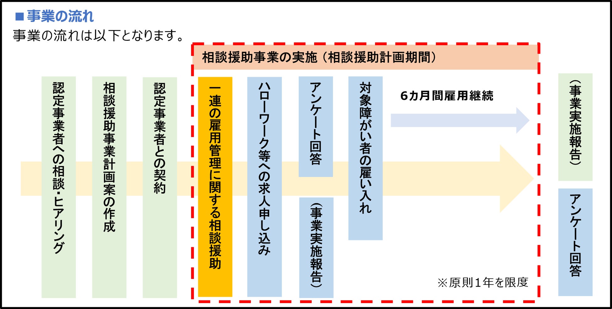 都道府県労働局長の認定を受けた事業者が障がい者雇用の経験やノウハウが不足する事業主に対して、雇入れやその雇用継続を図るための一連の雇用管理に関する相談援助をおこないます。