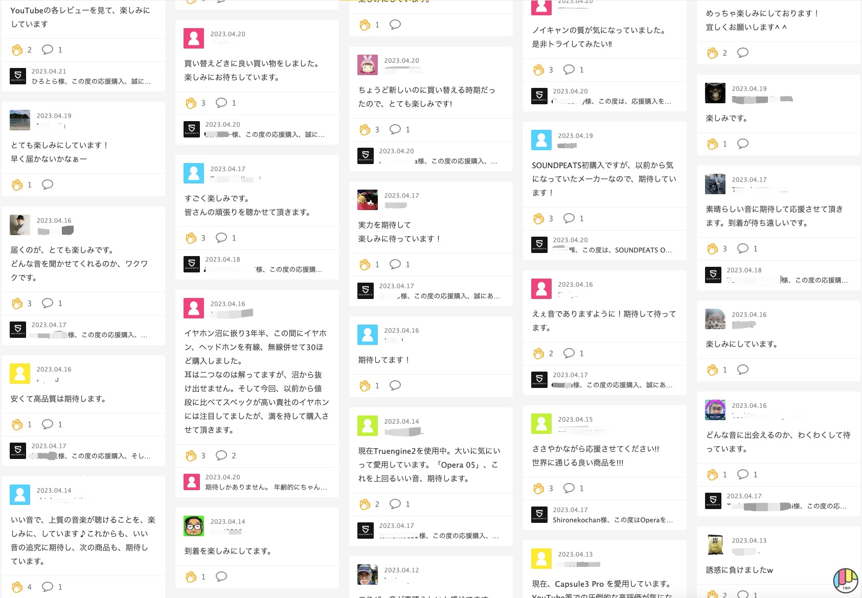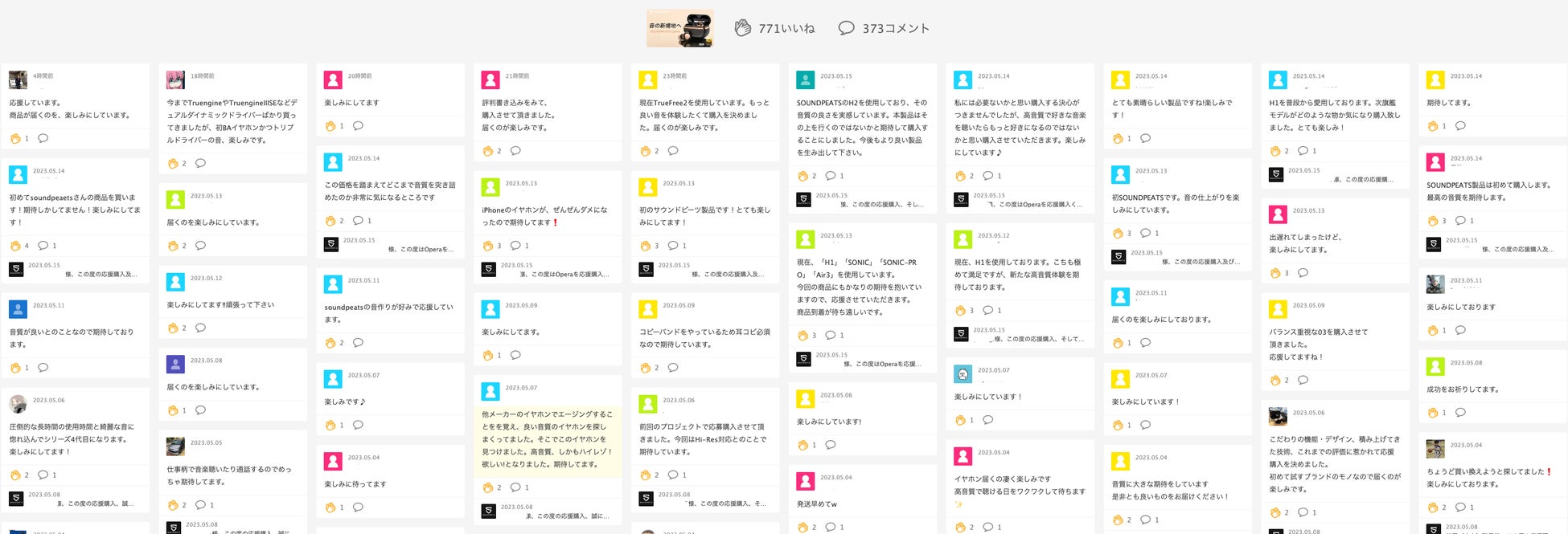 本プロジェクトでは360件以上の応援コメントが集まっており、日頃よりSOUNDPEATS製品を愛用いただいている方からの温かいお言葉がたくさん届いています。