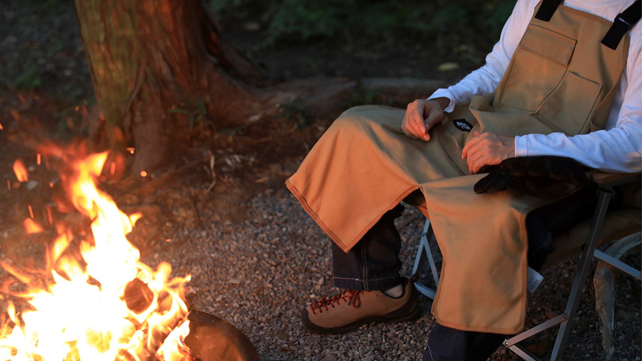 キャンプに必要な機能を備えた難燃素材のキャンプエプロン。
