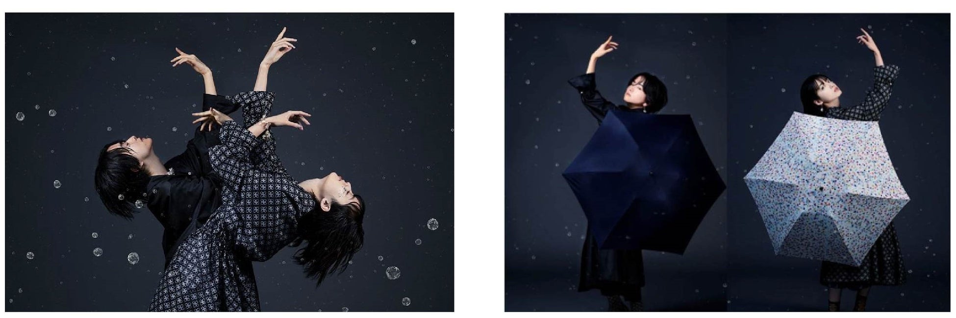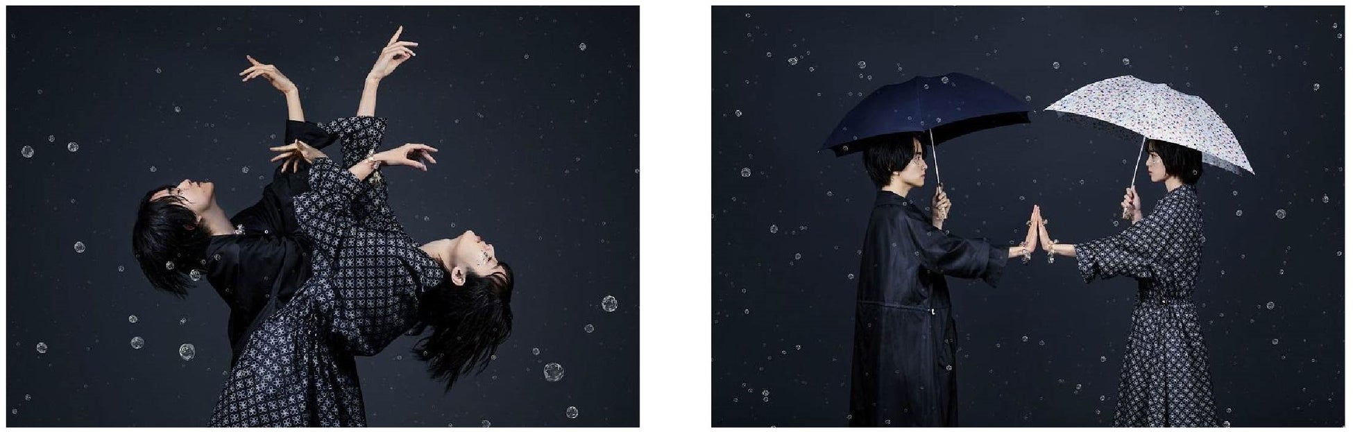 雨の中、人と人が出会った瞬間に時が止まり、雨は雨粒となって空中に留まります。そして動きだすのは、ふたりだけの世界。雨に咲く花のように儚く美しいふたりのコラボレーション。その一瞬を、永遠に閉じ込めました。