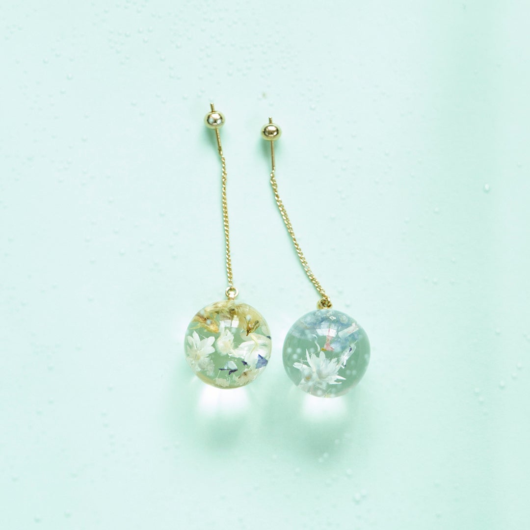 しずくが落ちる一瞬を切り取り、空中にとどめたかのようなポエティックなイヤリングとピアス 。アクリルビ