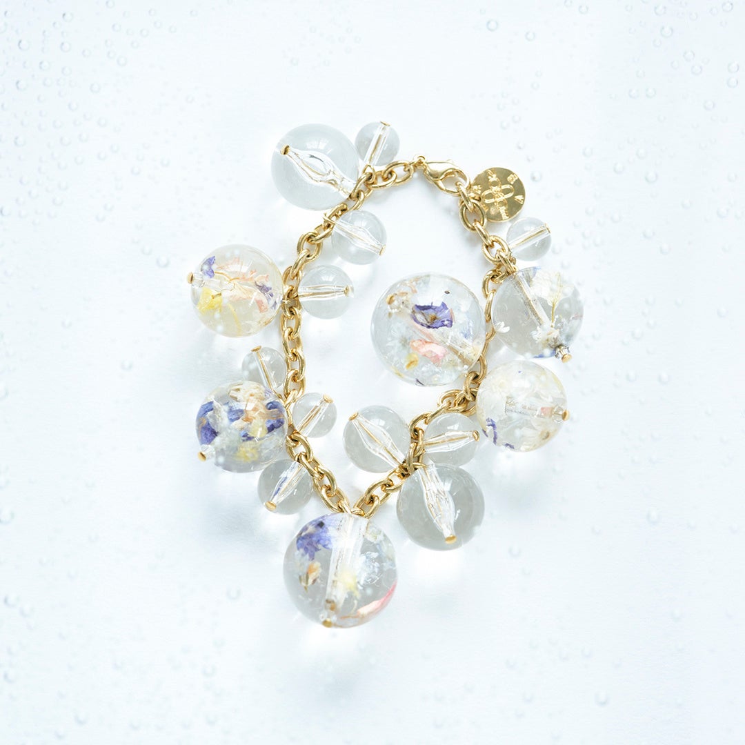 本物の花の一瞬を閉じ込めたフラワービーズと雨粒を思わせるクリアビーズをつないだブレスレット。こ