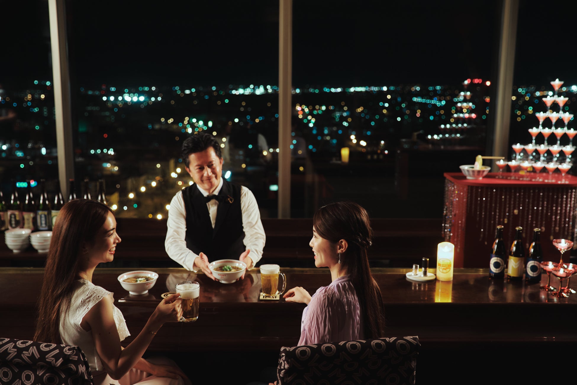 旭川を楽しみ尽くす「街ナカ」ホテル「OMO7旭川 by 星野リゾート」では、2023年6月1日から8月31日まで、旭川で1番高い建物にあるBarで、夜景・旭川醤油ラーメン・サッポロビールを楽しむ「ラーメンどんぶりビアBar」を開催します。当ホテル最上階の17階にあるBarスペースで、旭川の夜景を眺めながら、旭川の醤油ラーメンとサッポロビールの組み合わせを楽しめるイベントです。さらに、ラーメンどんぶりやグラスタワーのグラスにはOMO柄の雷紋がはいっており、上質ながらもちょっと面白い体験ができます。