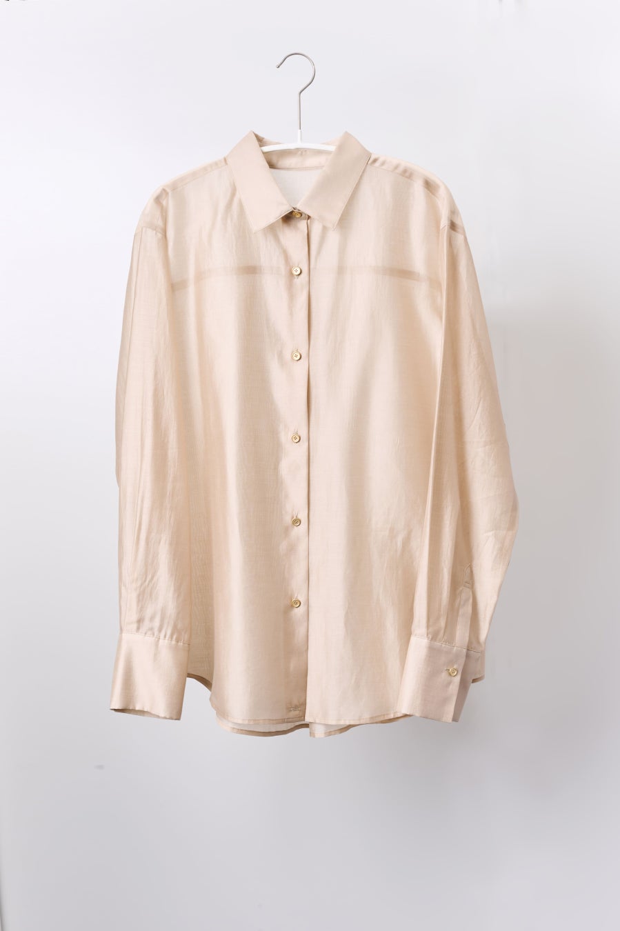 ①軽やかでシアー感がきれいなローン素材を使用したシャツ。単品使いでもタイト目なニットやカットソーに重ねて羽織でも使えます。