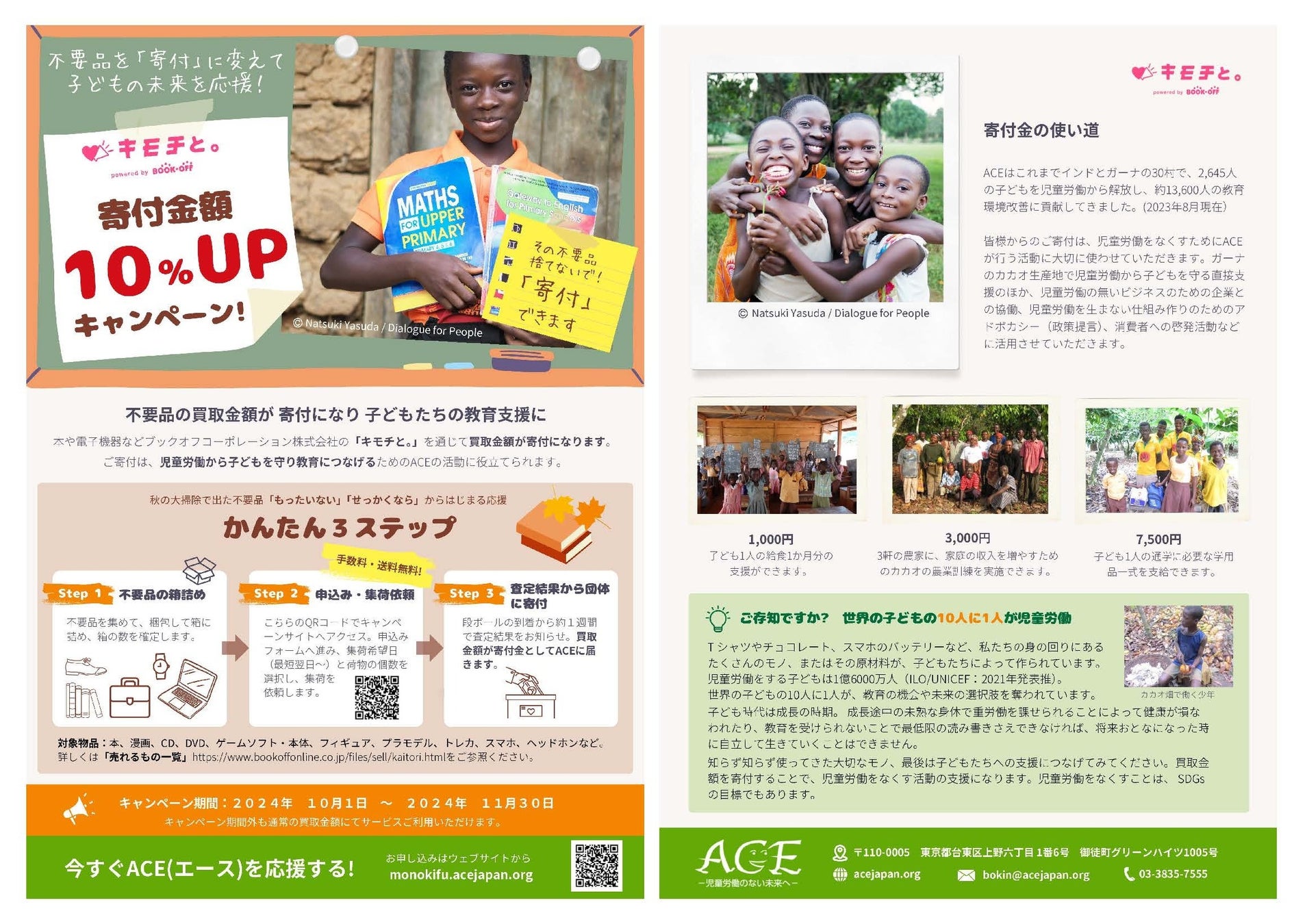 不要品を「寄付」に変えて、ACEと一緒に子どもの未来を応援! ブックオフ「キモチと。」寄付金額10%UPキャンペーン
