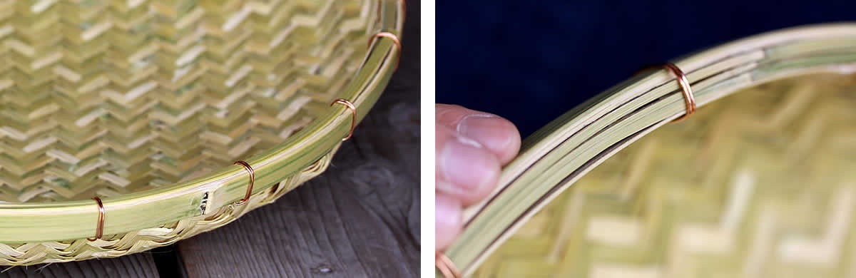 適度な丸みのある深みが特徴で、野菜を干したり運んだりするのに便利です。淡竹や孟宗竹を使用した編み込みは、裏から見てもしっかりと目が詰んでおり、美しさと丈夫さを兼ね備えています。ざるの部分へは金属類を一切使用せず、縁部分には孟宗竹を使用し、細く割った竹ひごを数本重ねて縁巻きし、銅線で何カ所も縛っており、頑丈な仕上がりとなっています。