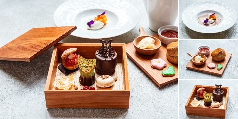 そこで、ハイアット 箱根では、開運ステイをより楽しんでいただくための特別メニュー“開運来福アフタヌーンティー”をご用意しました。おせち料理にヒントを得てペストリーシェフ風戸浩幸が考案したメニューは、幸運が訪れるよう縁起をかついだ食材やデザインが取り入れられています。一つひとつに願いを込めて丁寧に仕上げられた小さなスイーツが、箱根らしさを感じる木製の箱の中に並び、見た目にも楽しい縁起の良いアフタヌーンティーが完成しました。レギュラーのシーズナルアフタヌーンティーコースよりライトなポーションですので、気軽にお楽しみいただけます。