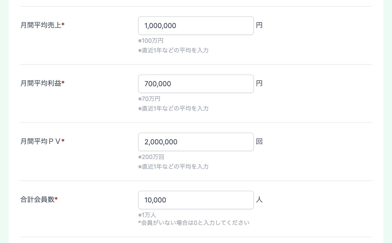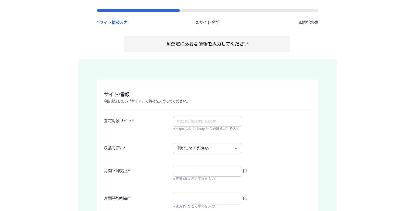 サイトジャンル・月間売上・月間PV/UU・会員数・運用歴など、AI査定を行うためのサイト情報を入力します。