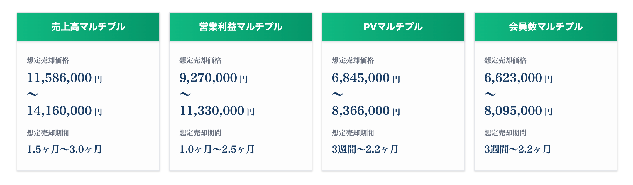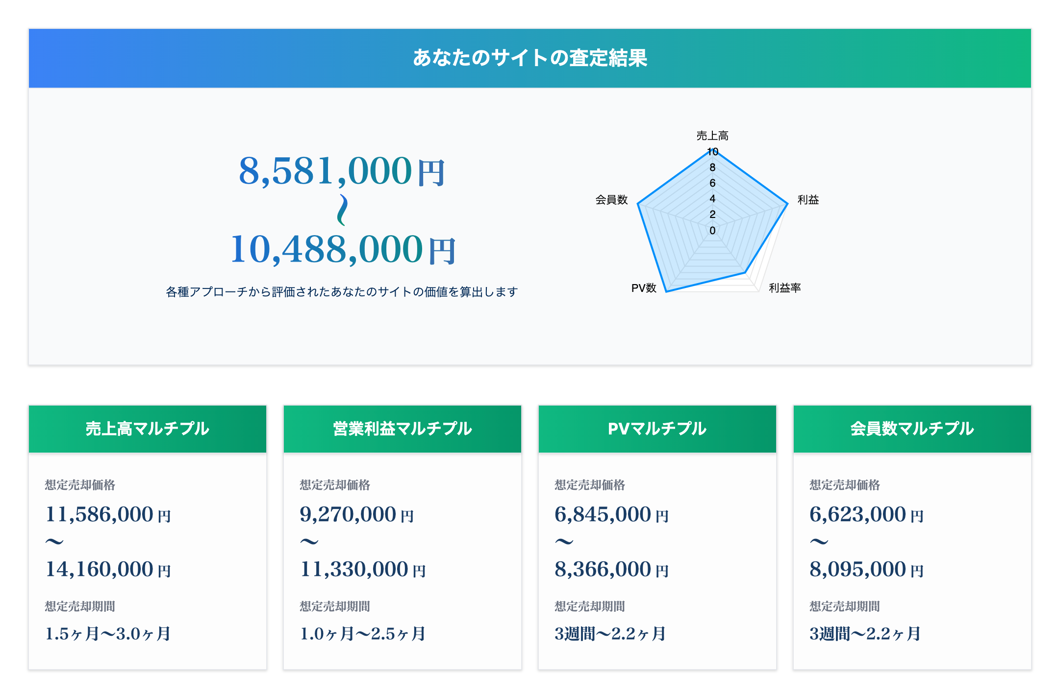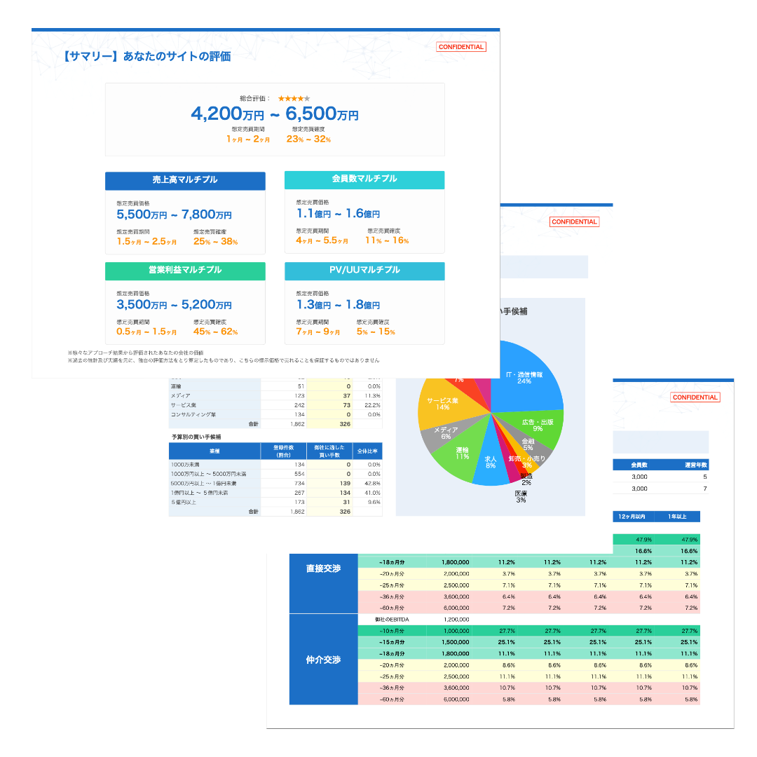 売上高マルチプル・利益マルチプル・会員数マルチプル・PVマルチプル等のアプローチの中から、適切な算定方法によりご自身のサイトの価値がAI価値算定されます。
