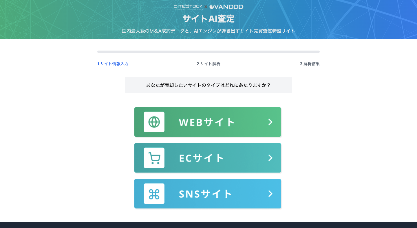 WEBサイト全般、ECサイト、SNSサイトの中から、査定したいWEBサイトのタイプを選択し、IT×M&A市場データに基づき様々なサイトの分析が可能です。
