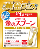 ■内容:イトーヨーカドーのアプリ会員様限定企画。5/1(日)に店頭で税込2000円以上お買い上げの上、レシートとアプリ画面をご提示いただくと、“金のスプーン”を先着でプレゼントいたします。