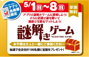 ■内容:イトーヨーカドーのアプリで謎解きゲームに挑戦しよう。さらに店頭で謎を解いていただいた方には、抽選で全店合計100名様に宝箱をプレゼント!