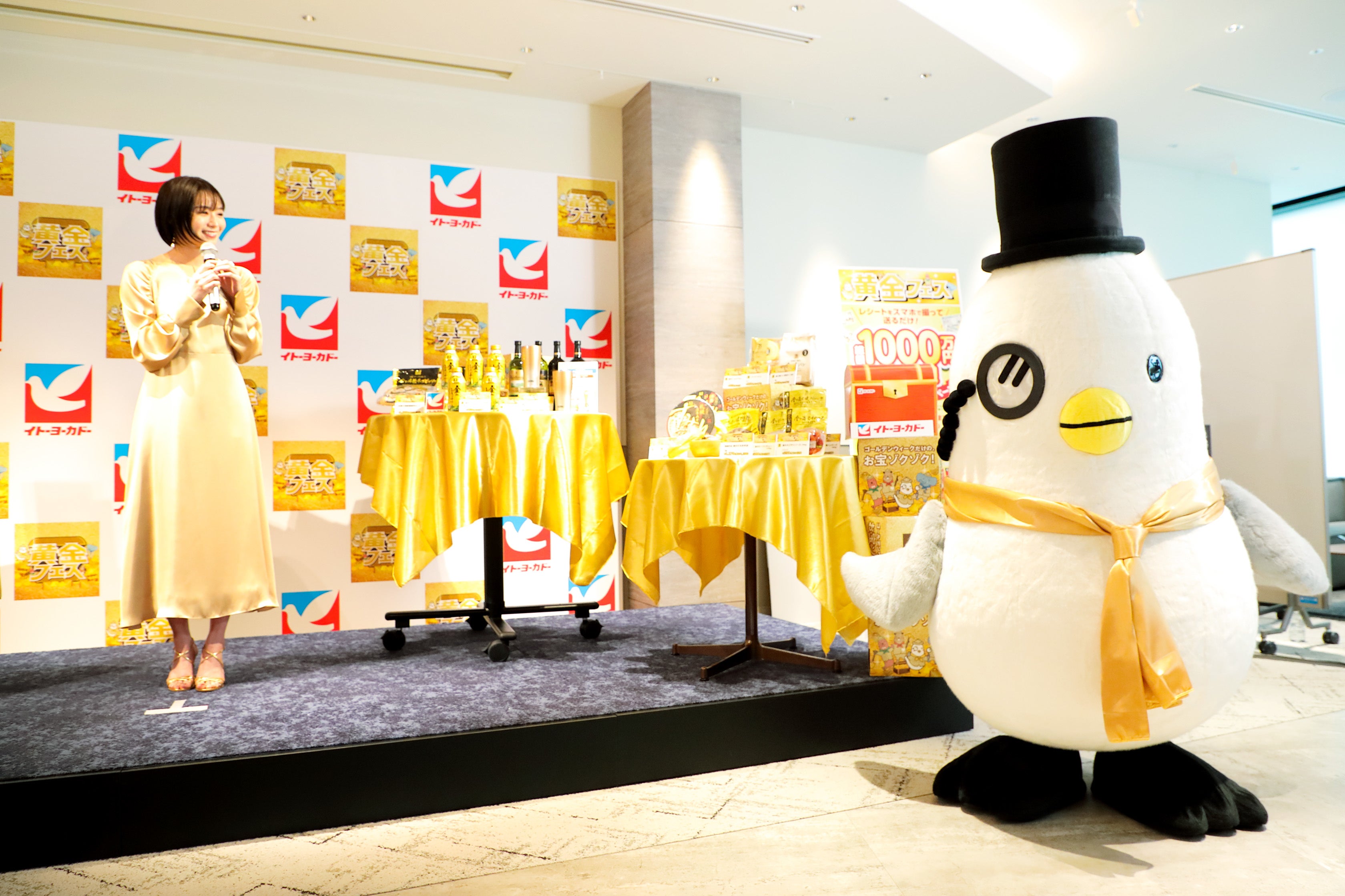 女優の「傳谷英里香」さんが黄金の衣装で登場。「金色の商品がたくさんあって、ワクワクします!」