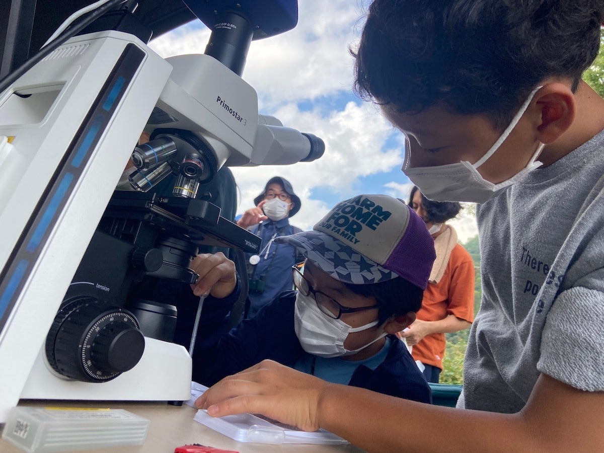 ドイツ生まれの光学機器メーカー「カールツァイス」製の双眼鏡を使って、公園を囲む自然遊歩道を散策。また、高性能の顕微鏡も使い、公園内の雑木林や池に暮らす生きものを観察します。