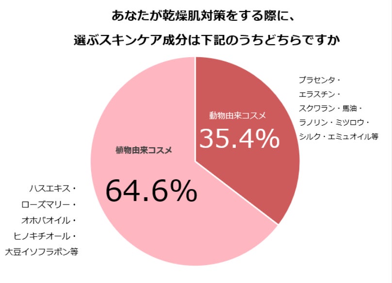 インテグリカルチャー株式会社(本店:東京都文京区、代表取締役CEO:羽生雄毅、以下「インテグリカルチャー」)が2023年1月に全国の20代~60代の女性1000人を対象に、「乾燥肌対策をする際に選ぶスキンケア成分」を調査したところ、64.6%(646人)が植物由来コスメ、35.4%(354人)が動物由来コスメを選択するという結果となりました。
