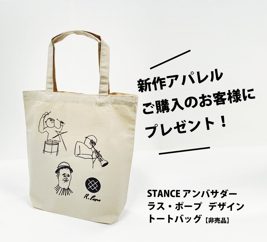 ●「アクティブアパレル」ご購入の先着100名様(渋谷パルコ店、なんばパークス店ともに)にSTANCEアンバサダー「ラス・ポープ」デザインの非売品トートバッグプレゼント!