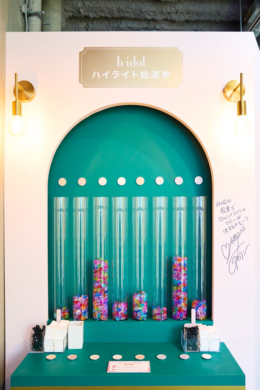 商品販売以外にも遊べるコンテンツとして、「ガチャガチャ」の他、「アカリンフォーチュンルーレット」と名付けた、吉田朱里による、恋のお告げカードや、アイドルを経験した吉田朱里ならではの、来場者に商品化してほしい色に投票して頂く「ハイライト総選挙」なども実施。どのフロアも細部までアカリンのこだわりが詰まったb idolらしい可愛い空間となりました。