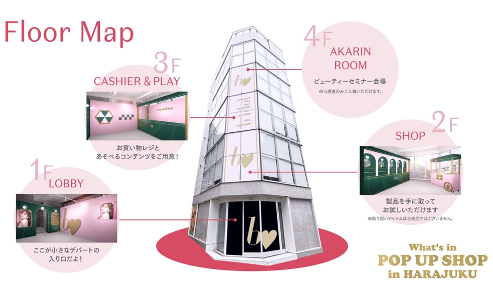 アカリンがつくる”小さなデパート“をコンセプトに、原宿のビルを1棟全て貸切り、1階~4階まで楽しめるショッピングフロアとビューティコンテンツを展開。連日多くのお客様が訪れ大盛況となりました。4日間の来場者数は3,000人を超え、ブランド初となる快挙を達成しました。