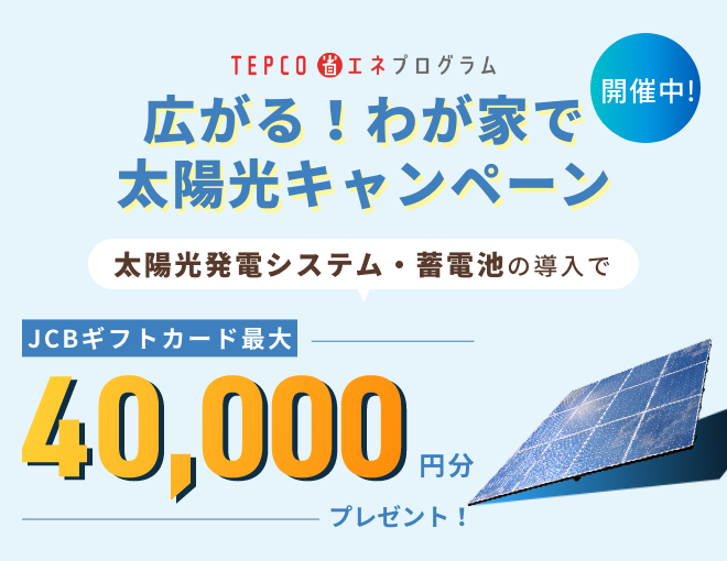 2023年7月3日~2023年9月29日の期間中に、TEPCOホームテックもしくは東電EPにお問い合わせをいただき、2023年12月20日までに、太陽光発電システム・蓄電池をご契約いただいた方にJCBギフトカード最大40,000円分を進呈いたします。