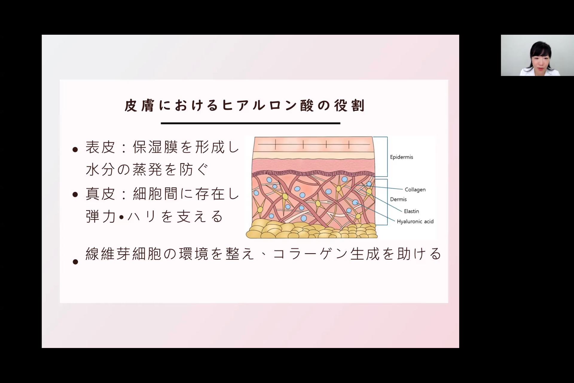 美容医療の視点から、ヒアルロン酸の構造、体内での働き、加齢による変化、そして美容医療における応用について解説しました。