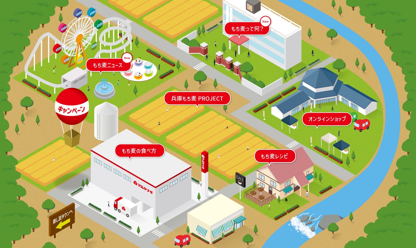 マルヤナギでは、主力商品「おいしい蒸し豆」シリーズと同様に、兵庫県加東市をはじめとする北播磨で栽培しているもち麦「キラリモチ」の普及にも注力しており、この「蒸し大豆タウン」から続く道の先に、この度「もちむぎ村」を新設することにしました。「もちむぎ村」では、もち麦に関する情報や、もち麦を通した産地の取り組み、もち麦を活用したお店の情報など様々な情報を順次掲載する予定で、“兵庫県産もち麦”に最も詳しいサイトとしてお客様に楽しんでいただけるよう、内容、見た目共に充実させてまいります。