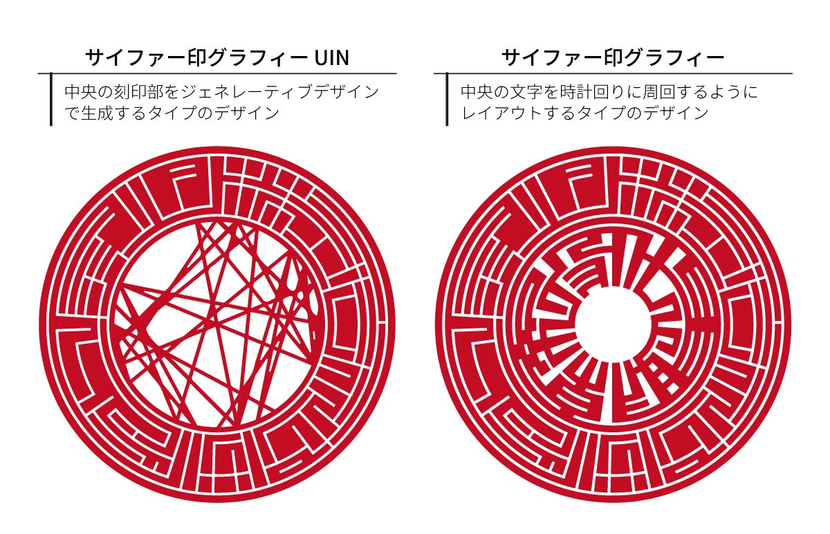 これが原型となり、中央にジェネレーティブアートを使った「サイファー印グラフィーUIN」と、中央に文字を周回するように繋ぐ「サイファー印グラフィー」が生まれました。