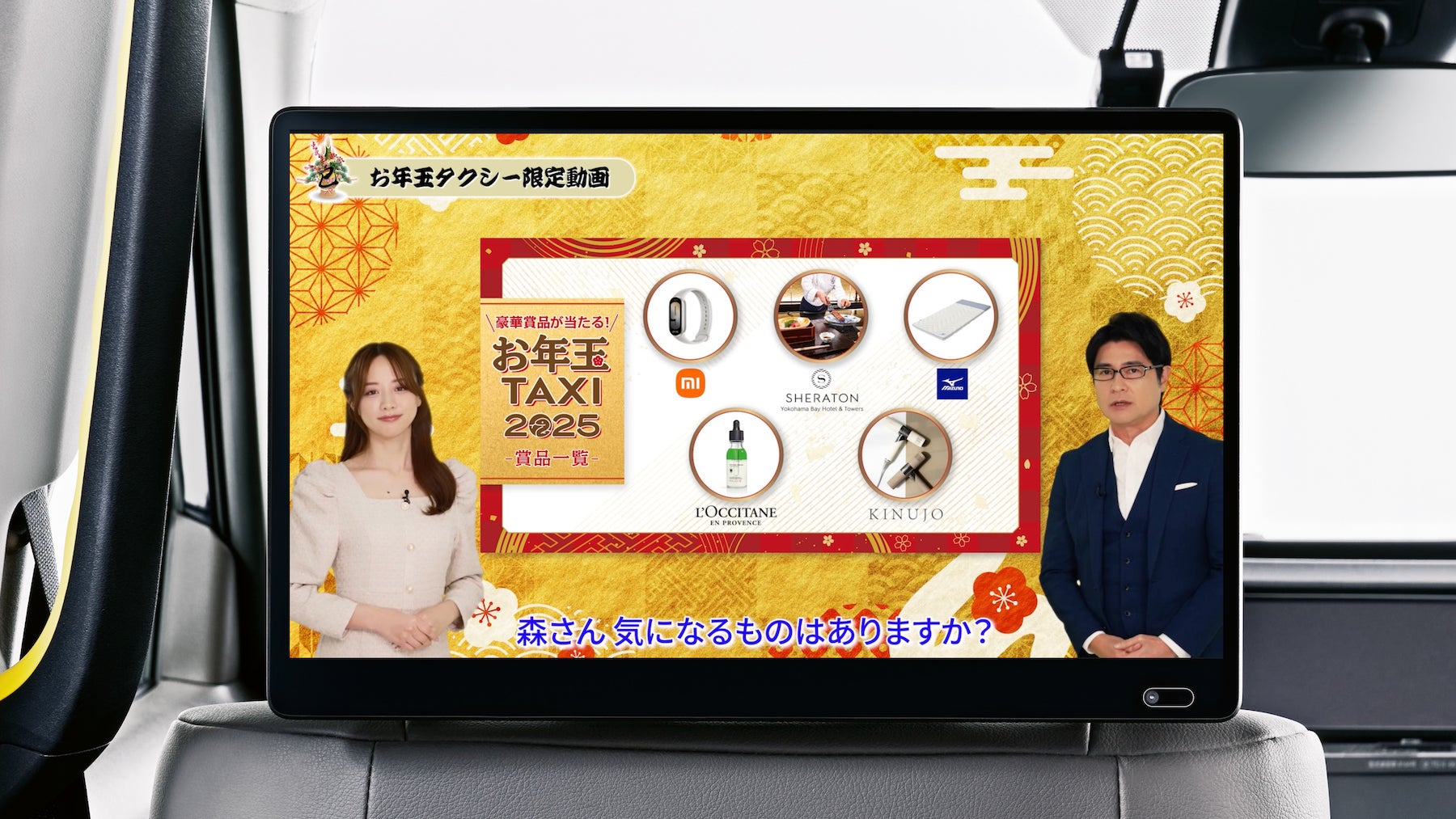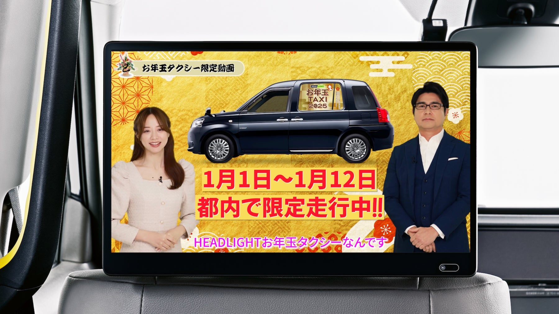 「お年玉タクシー2025」の特徴としては、タクシーの窓ガラスに「お年玉タクシー2025」のクリエティブが表示されており、車内では乗務員から乗車記念ステッカーをお渡しします。車内のサイネージでは、移動時間の情報番組「HEADLIGHT」MC である安東弘樹さ ん・森香澄さんよりお年玉タクシーに関する紹介動画と共に、「HEADLIGHT」公式Xアカウントにて開催予定の豪華商品が当たるお年玉キャンペーンに関連する動画を放映します。なお、本タクシーはタクシーアプリ「S.RIDE」による指定配車はできません。