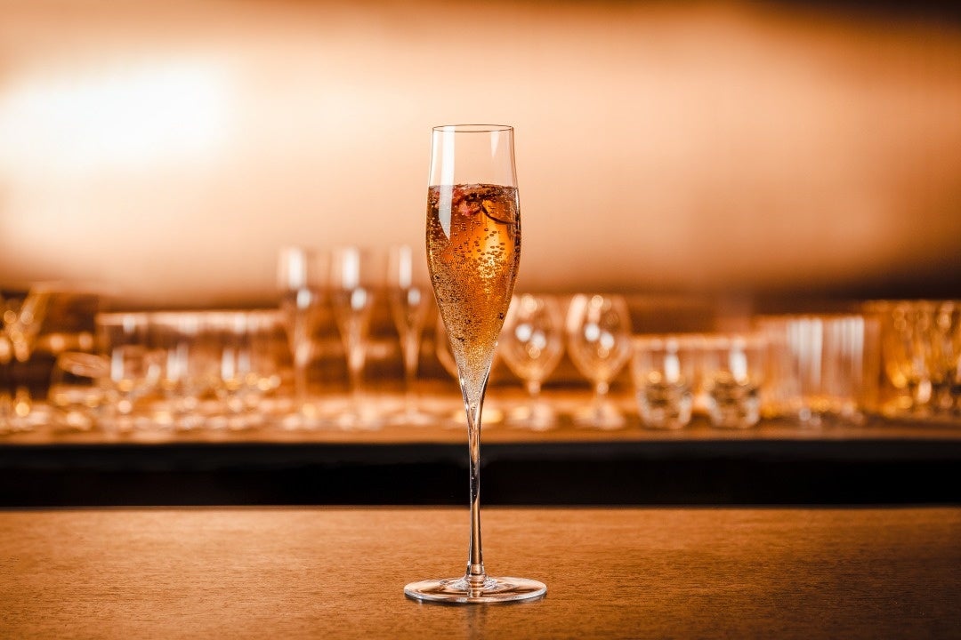 シャンパンにアマレット、レモン汁で全体の味をまとめあげ、サクラの花を浮かべたシャンパンカクテル。