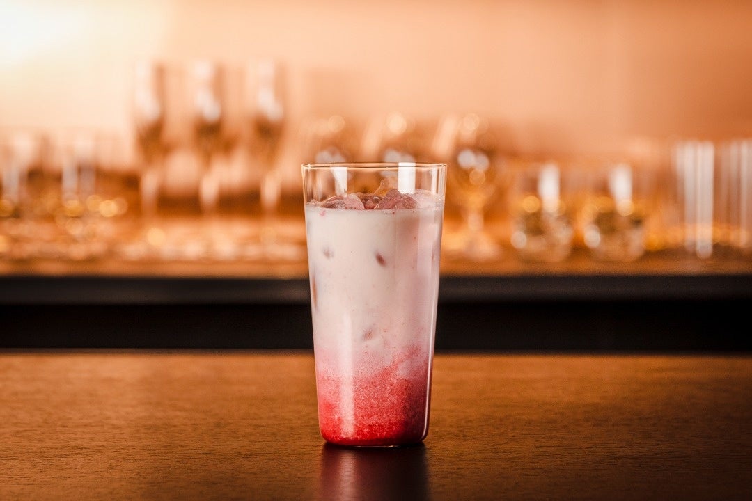 グリオットチェリーのピューレをサクラとアーモンドミルクで割った⼀杯。