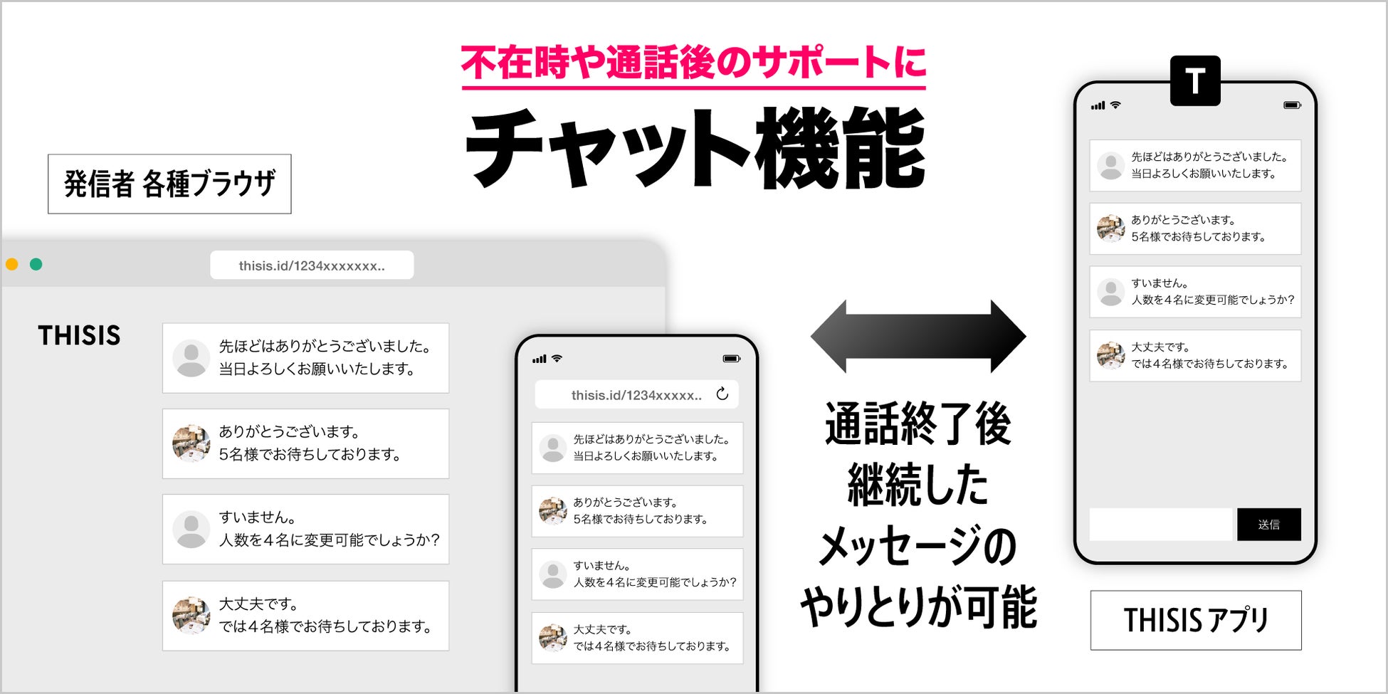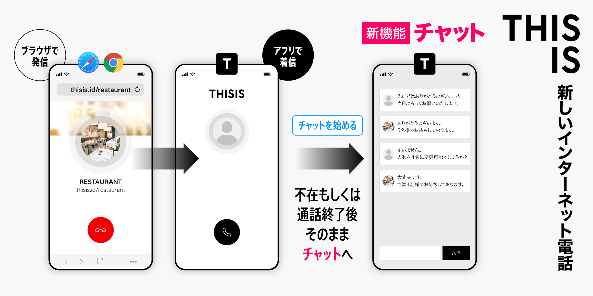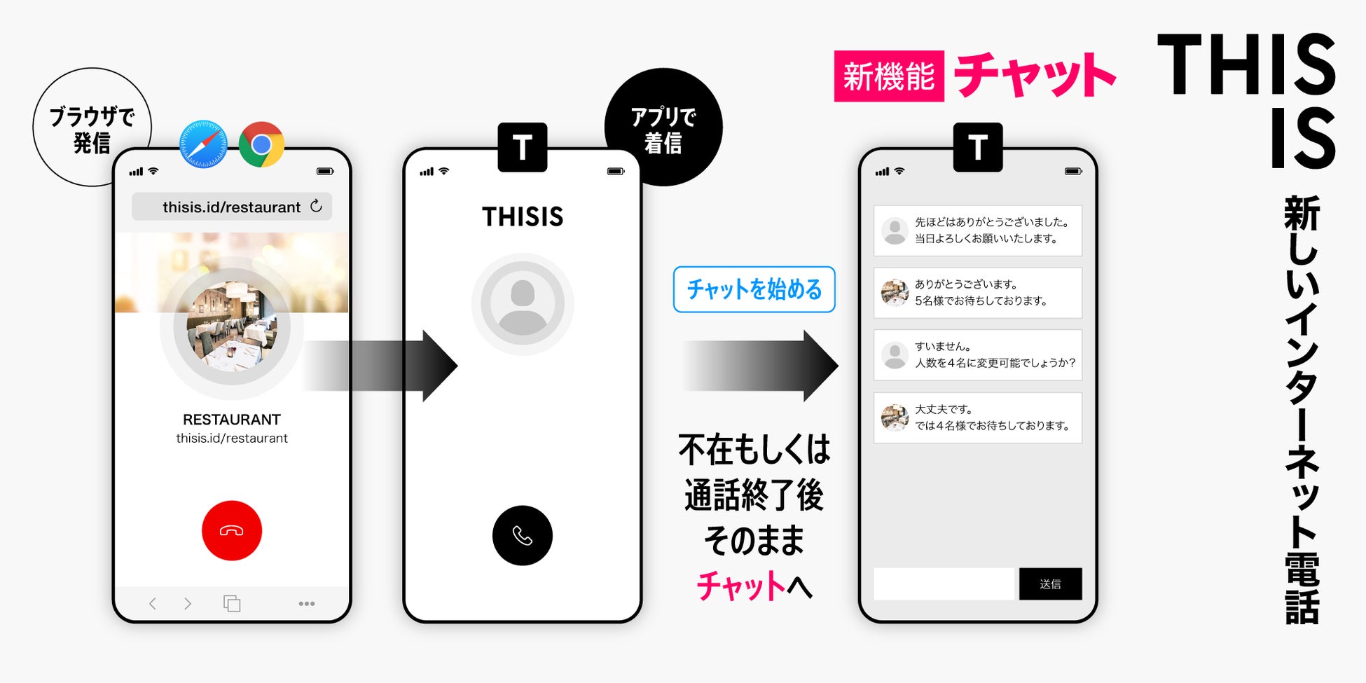 また今回のアップデートにより、電話に応答できなかった場合でも発信者との間でチャットによるテキストメッセージの送受信が可能になりました。各種お問い合わせの窓口として、予約受付の窓口として、これまで以上に安心してご利用いただけるようになったTHISISの高品質な無料通話を、是非この機会にご体験ください。