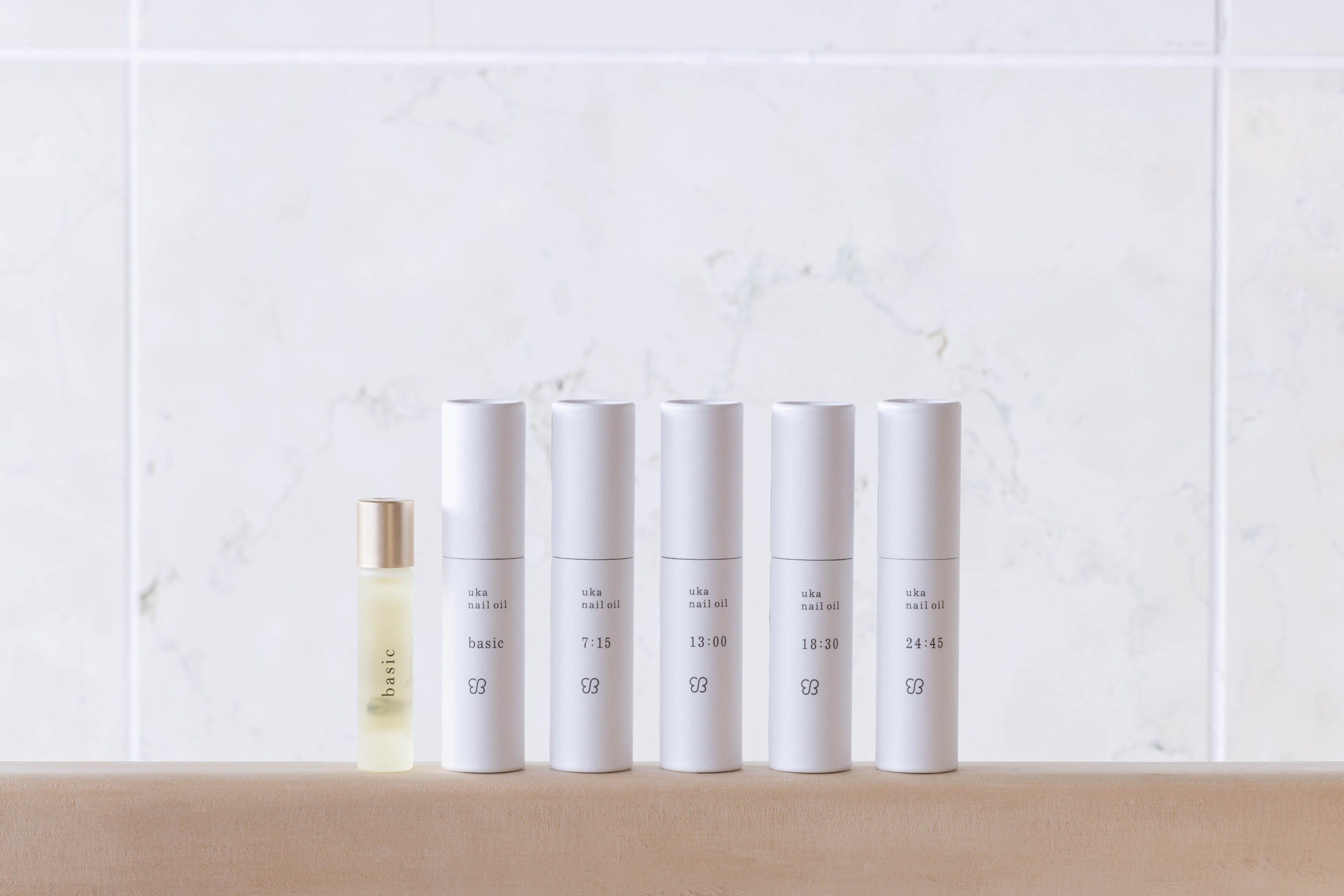 ukaを代表するプロダクトの天然精油のネイルオイルは5種類。お好きな香りをお選びいただけます。「7:15」「13:00」「18:30」「24:45」「basic」と、ストーリーに合わせて香りをセレクト。使いやすいロールオンタイプで爪周りはもちろん、首や肩などにフレグランス感覚でお使いいただけます。