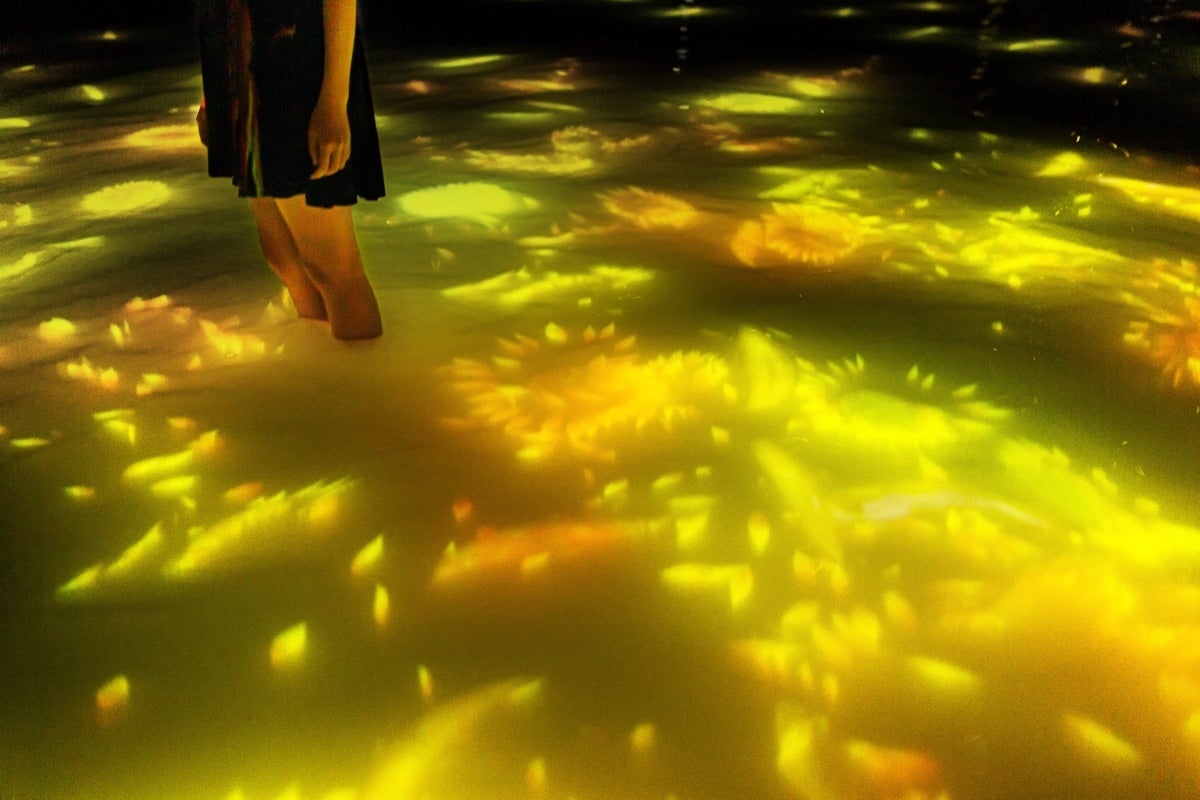 ミュージアム内の作品「人と共に踊る鯉によって描かれる水面のドローイング - Infinity」が、7月1日(金)から7月31日(日)までの期間限定でひまわりが広がる空間に変化します。