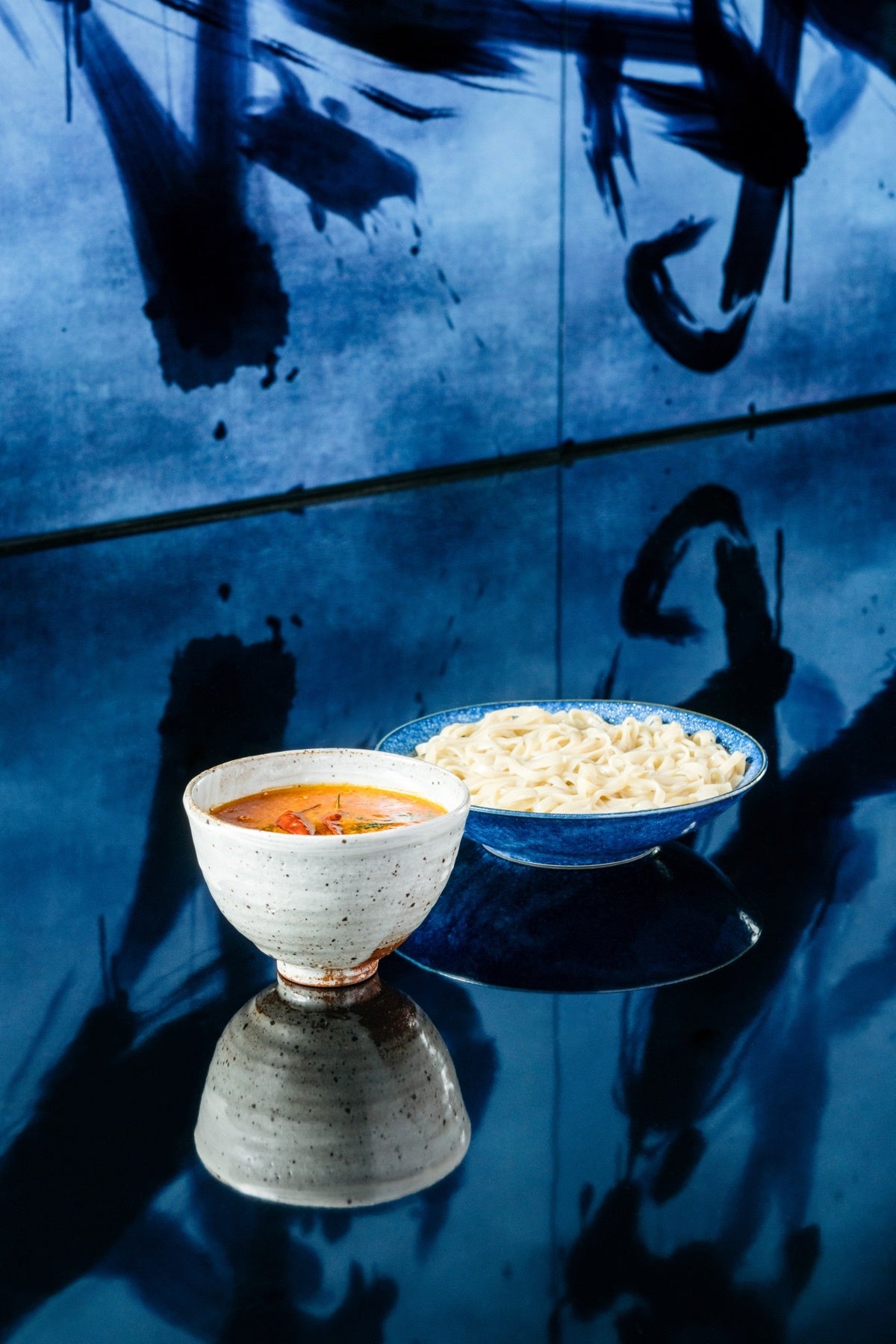 チームラボプラネッツの新作、《Floating Flower Garden》を想起させる、梶谷農園のエディブルフラワーを贅沢にあしらった華やかな一品。 旨味、甘味、酸味をバランスよく配合した冷たいスープで、見た目だけではなく食べ応えと清涼感の共存する一杯に仕立てました。水で締められたしなやかなコシの自家製の中太麺は、北海道産小麦をベースに有機農業の町、宮崎県綾町の無農薬全粒粉を加えた、風味豊かなツルツルの食感です。 ヴィーガンとは思えない程の深いコクと香りをお楽しみ頂けます。