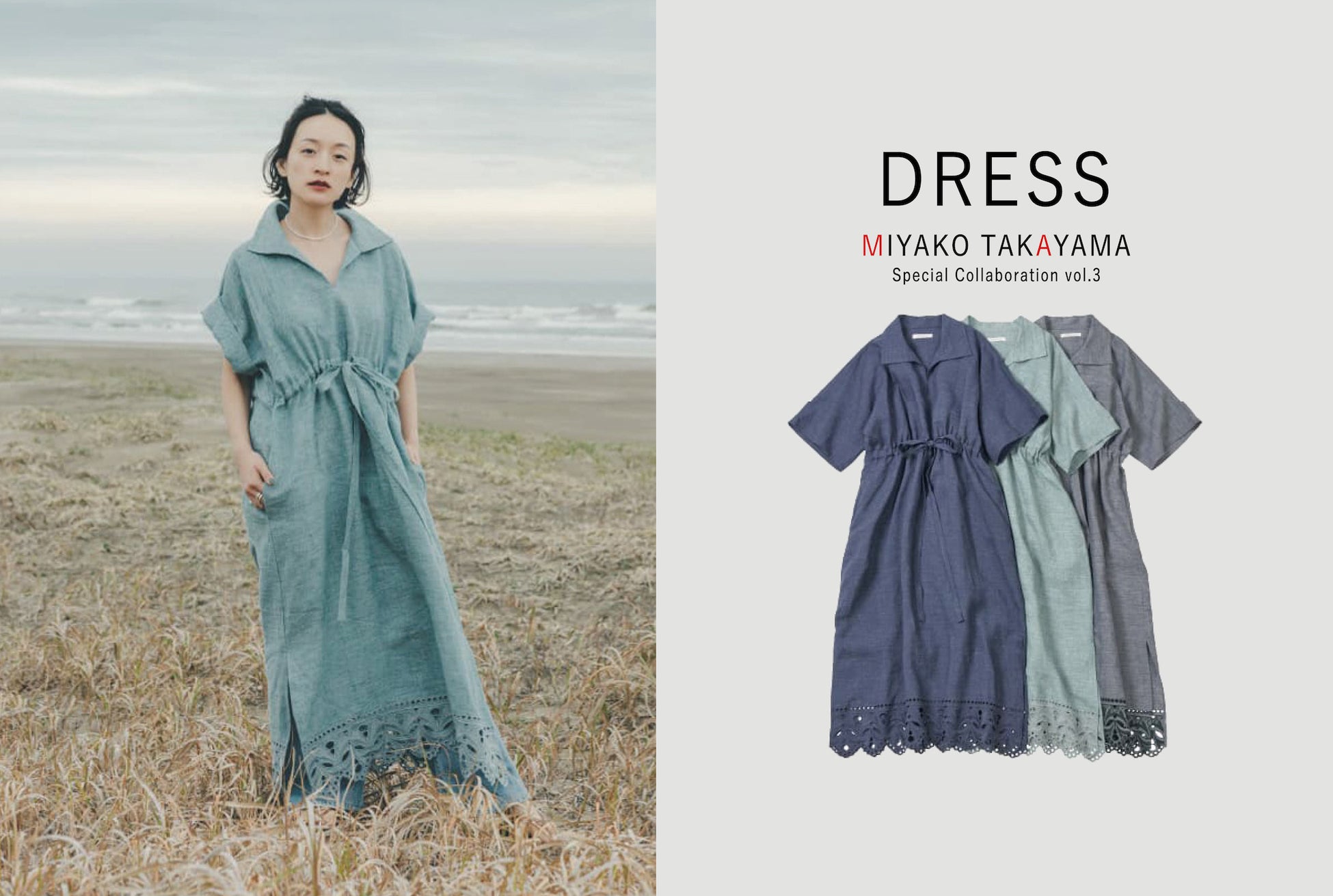 人気モデル 高山都さんとのコラボレーション第3弾 は、高山さんが年末のパリ旅行で出会い、惹かれたレースから・・・。「日常をロマンティックにドレスアップ -大人の甘さとラフさのあいだ-」をテーマに、華やかなカットワークレースが施されたノースリーブシャツ、ギャザーフレアスカート、スキッパーワンピースの3アイテムをラインアップ。大好きなデニムのようなカラーリングで日常にもスッと馴染み、多様なスタイルが楽しめるアイテムに仕上がりました。また、素材はさらりとした肌触りのよいリネン100%のシャンブレー生地で、着るほどに肌に馴染んでゆく風合いも魅力です。