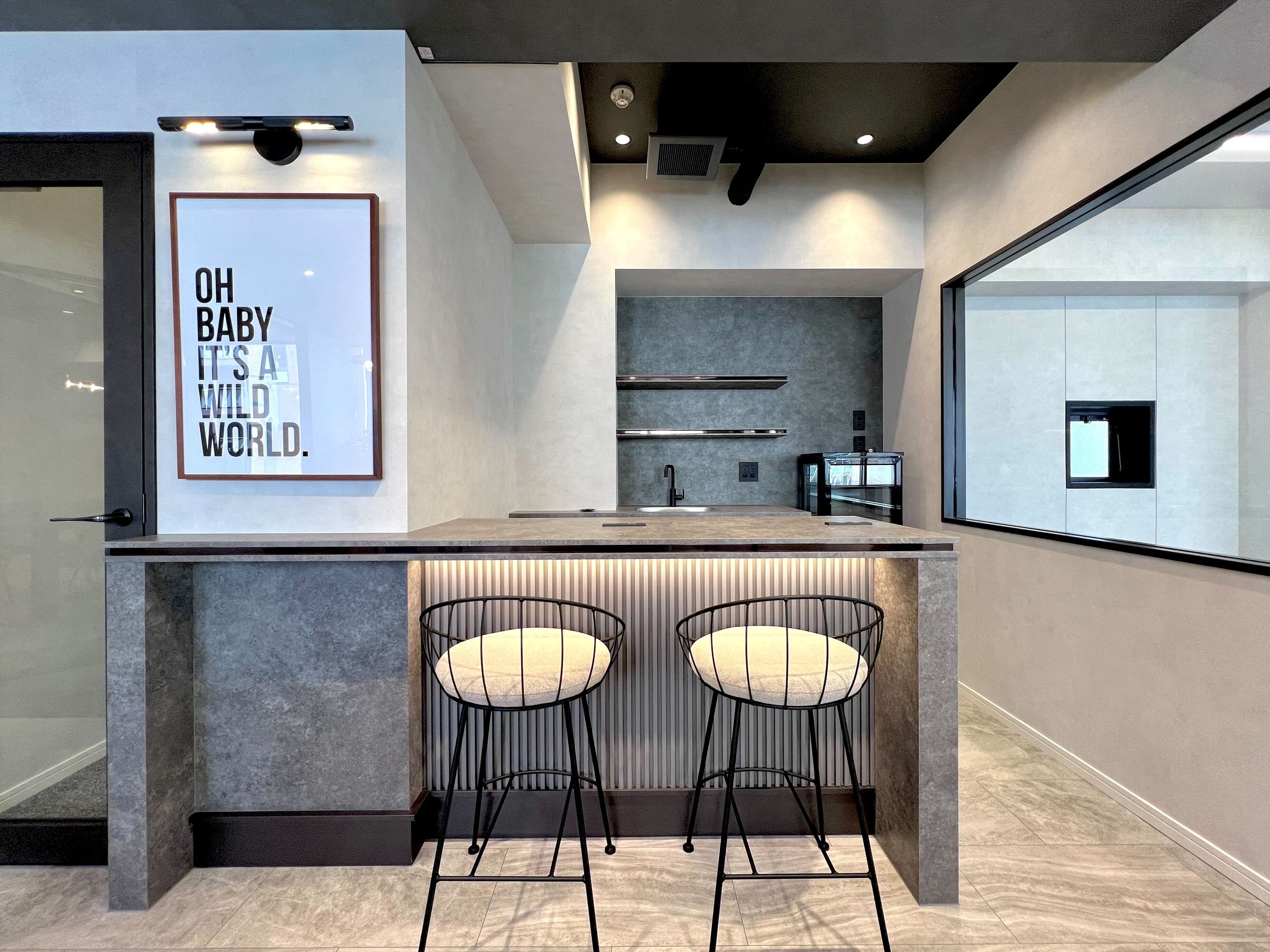渋谷区東2丁目の明治通りに位置する「JP-BASE渋谷」は、モノトーンのシンプルな色合いの中にメタルメッシュなどインダストリアルな素材を散りばめ、渋谷エリアを意識した内装に仕上げました。長方形のフロアには、曲線などのスムーズな導線と奥行き感を演出しています。