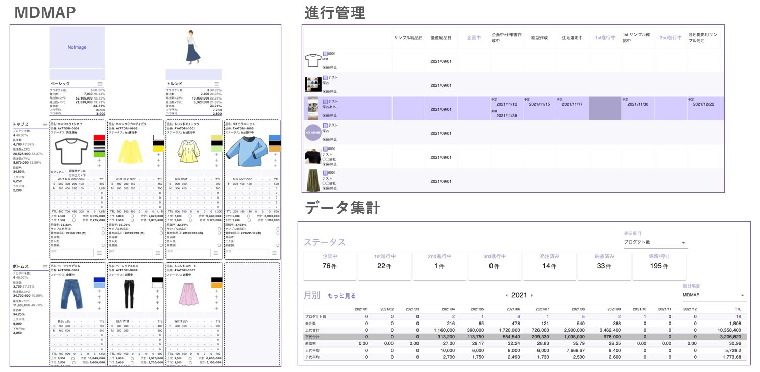 製造予定商品にひもづくあらゆるデータを蓄積できます。これにより進捗を把握することはもちろん、MDや企画、ECなど別部門への共有や連携がシームレスにできるようになります。