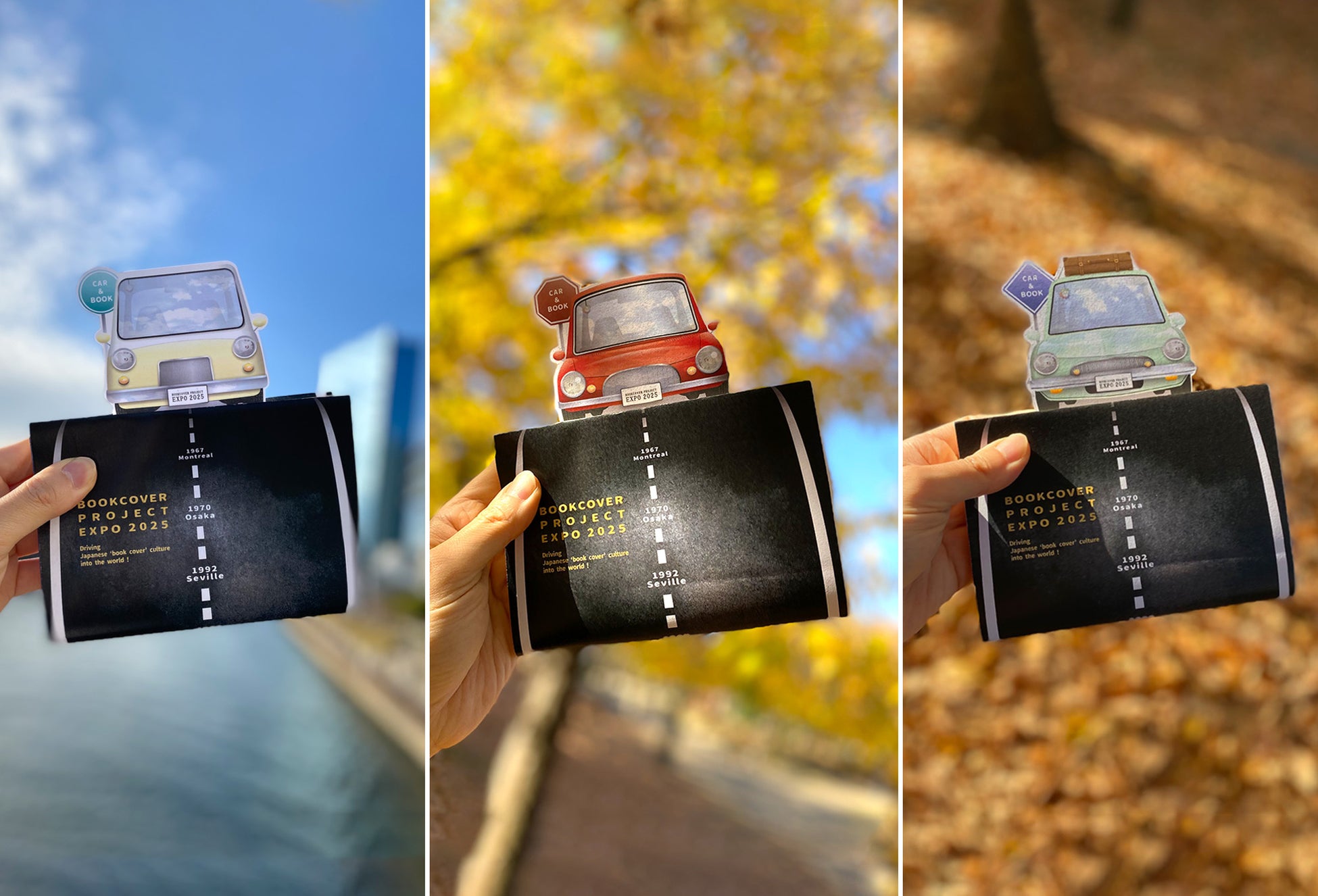 「自動車」と「2025年大阪・関西万博」のコラボレーションデザインです。栞は1970年に開催された大阪万博開催の頃に走っていたレトロカーをモチーフに。カバーは道路にこれまでの万博年表を記すことで、過去から現在までの時間の流れをデザインし、「いのち輝く未来」への旅路を表現しました。