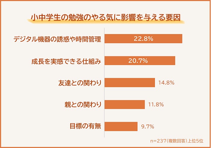 「小学生・中学生の子どもの勉強のやる気に影響を与える要因は何だと思うか」と聞いたところ、1位は「デジタル機器の誘惑や時間管理(22.8%)」、僅差の2位は「成長を実感できる仕組み(20.7%)」でした。以下、3位「友達との関わり(14.8%)」、4位「親との関わり(11.8%)」、5位「目標の有無(9.7%)」の結果です。