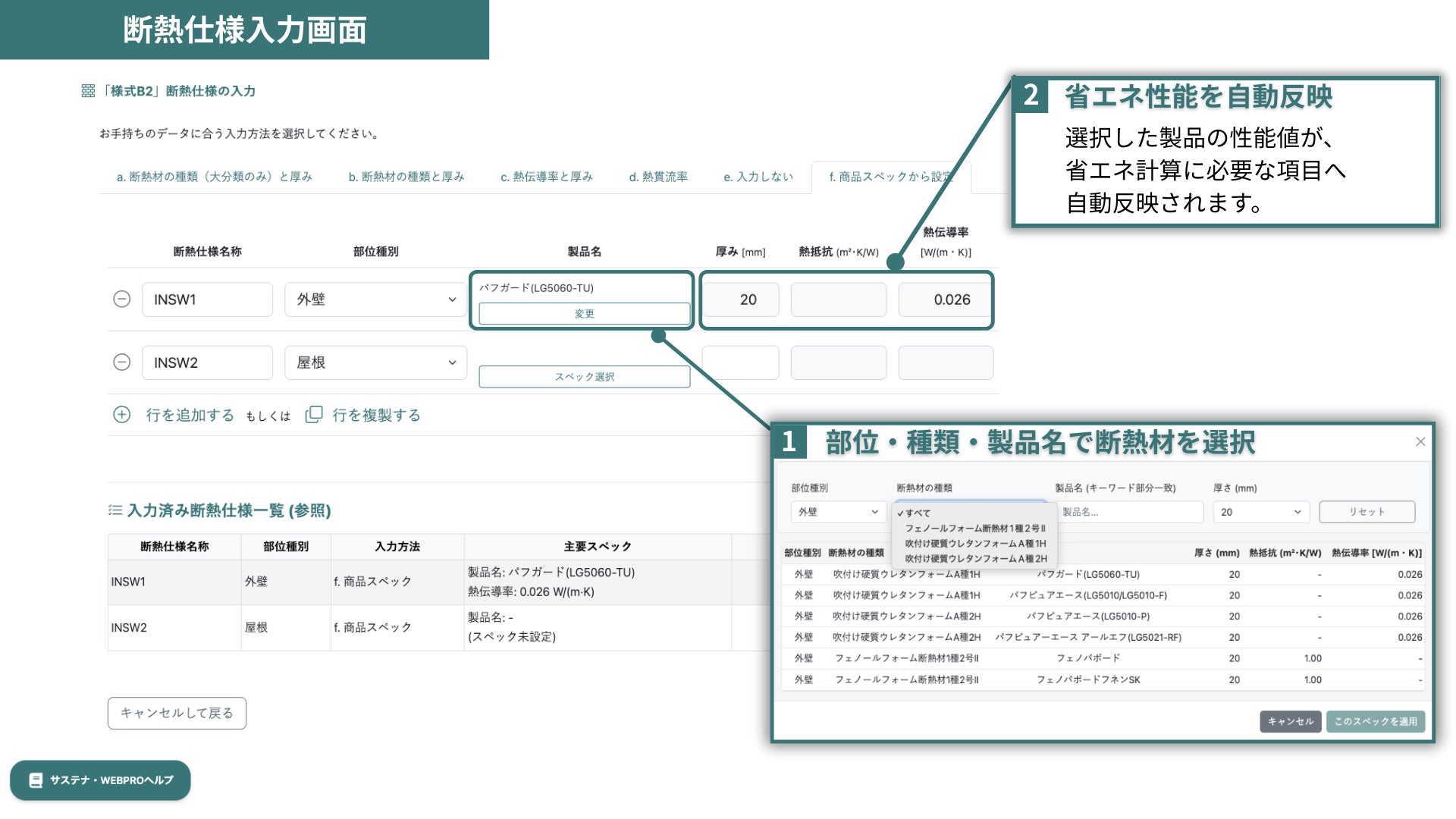 断熱材の選定に際しては、施工可能な部位、材料区分、必要熱抵抗値(R 値)、断熱厚などの複合条件が関係します。今回の連携では、断熱入力画面で下記の技術的絞り込みが可能となりました。