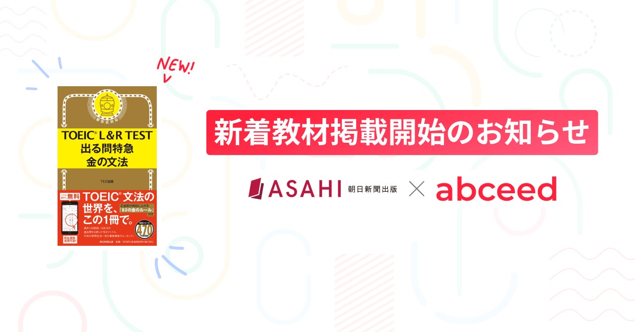 株式会社Globee(所在地:東京都港区、代表取締役社長:幾嶋 研三郎、以下 Globee)は、AI英語教材「abceed(エービーシード)」(https://www.abceed.com/)にて、株式会社朝日新聞出版(所在地:東京都中央区、代表取締役社長:市村友一)が刊行する、TEX加藤氏著書の『TOEIC® L&R TEST 出る問特急 金の文法』の掲載を開始したことを報告させて頂きます。