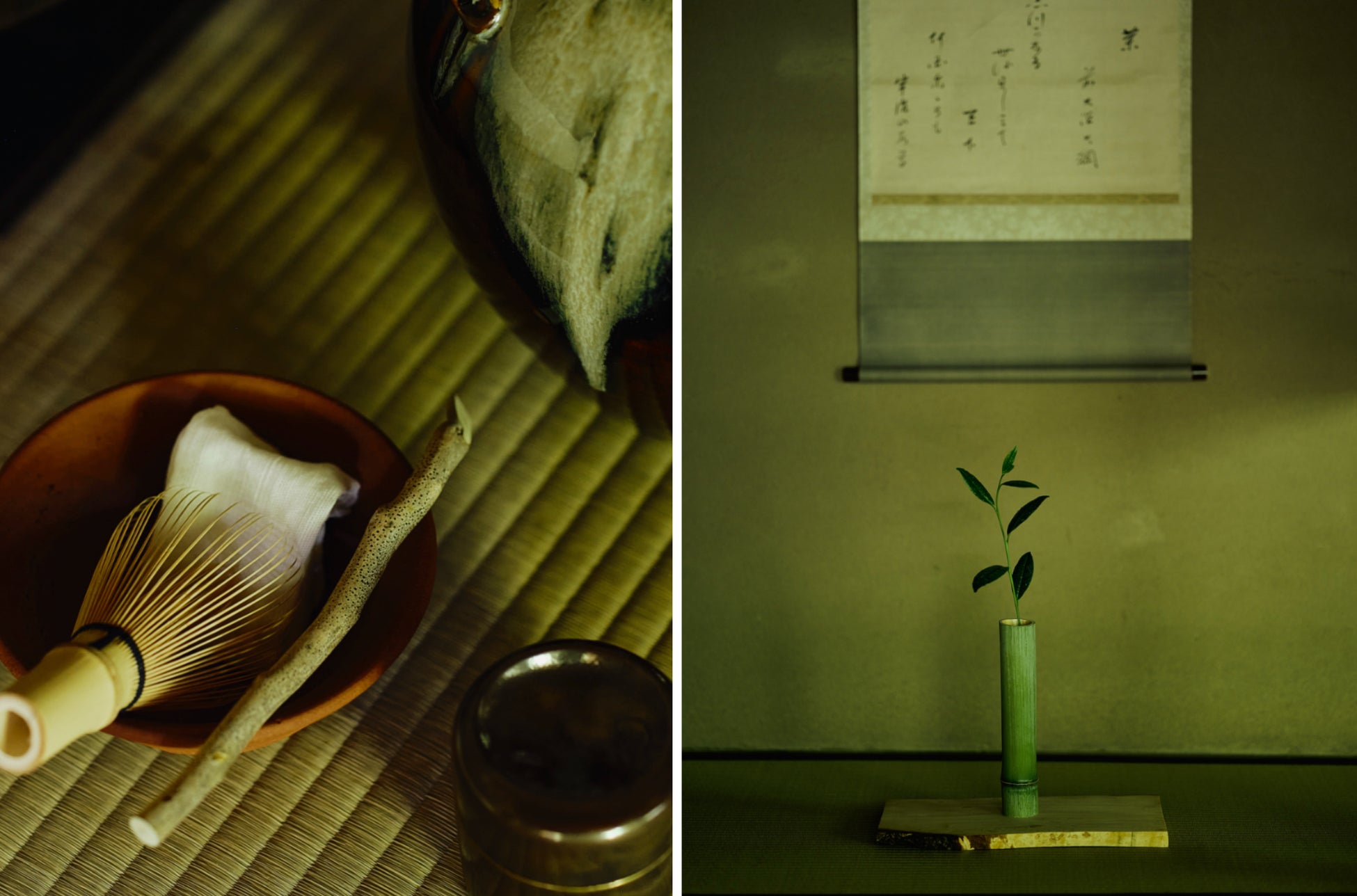 掛け軸には江戸時代後期に大徳寺黄梅院住職を務められた大綱和尚の茶の歌「静かなる 世を楽しみて 天下 何国にても 宇治の若草」を、青竹を切った花入に宇治白川の茶の木(製茶辻喜より提供)を、水指には茶壺(石臼で擂りつぶす前の抹茶、すなわち碾茶を保管するために用いられる陶器製の壺)を見立て、床から点前座にかけて、新茶の物語を表現しました。