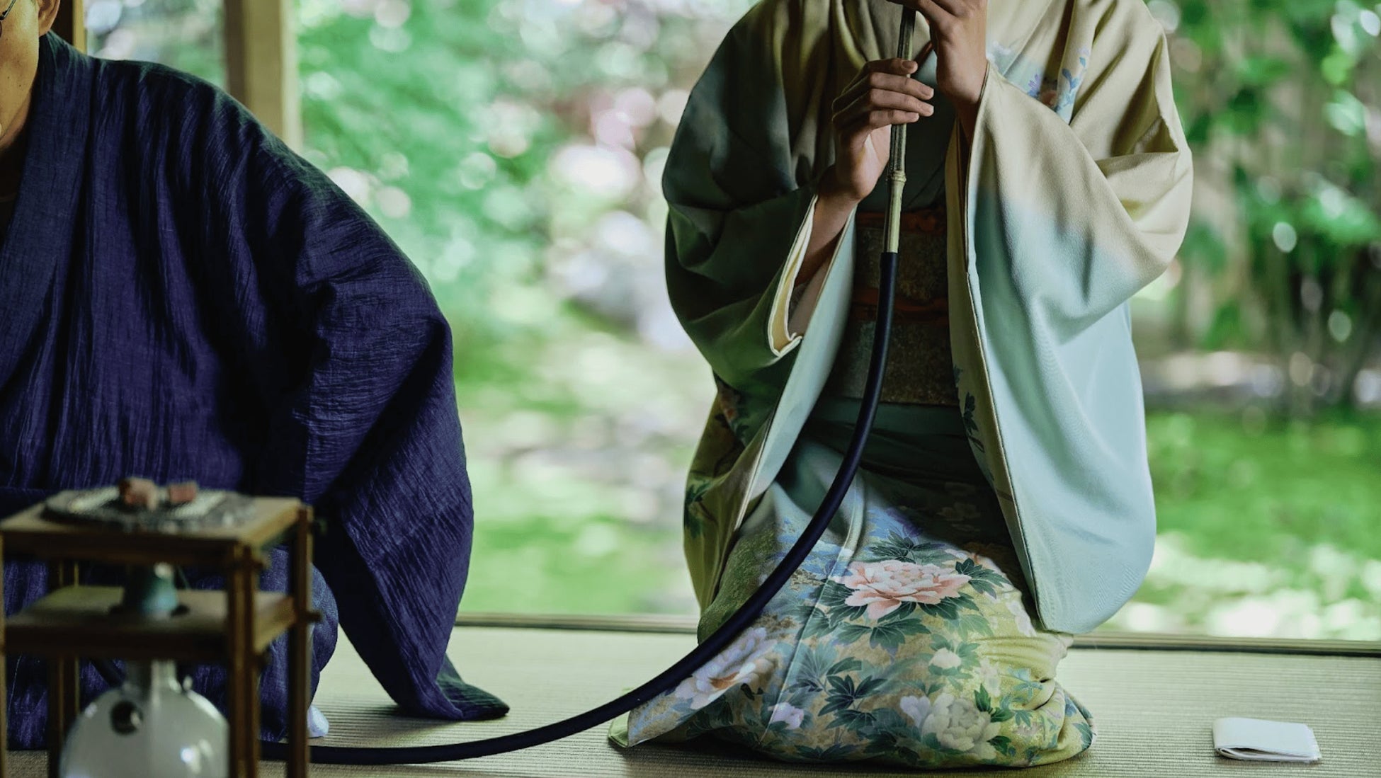 また、京都を拠点に活動するアートコレクティブの「Ochill(オチル)」の協力のもと、水タバコの原理を応用しタバコ葉の代わりに茶葉を用いたノンニコチンの新たな嗜好品 “吸うお茶” も振舞われ、自然の中にあるものから作られた茶道具と“吸うお茶”の煙で茶畑の朝露を表現しました。